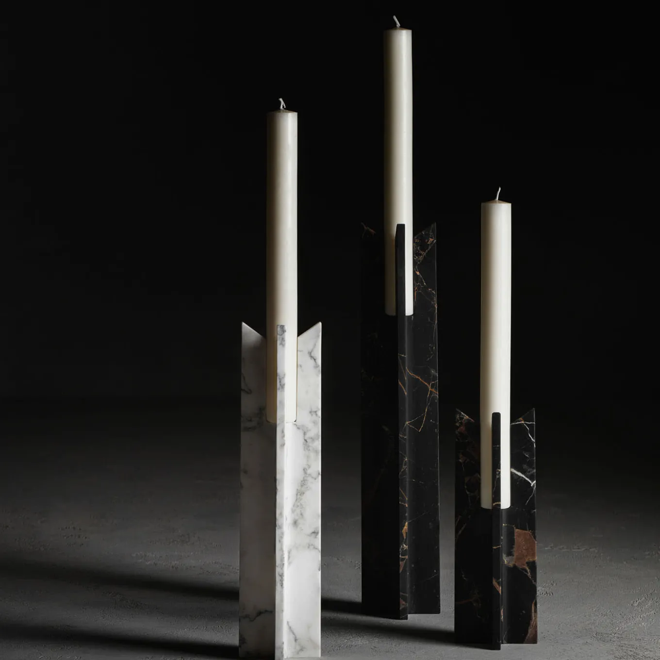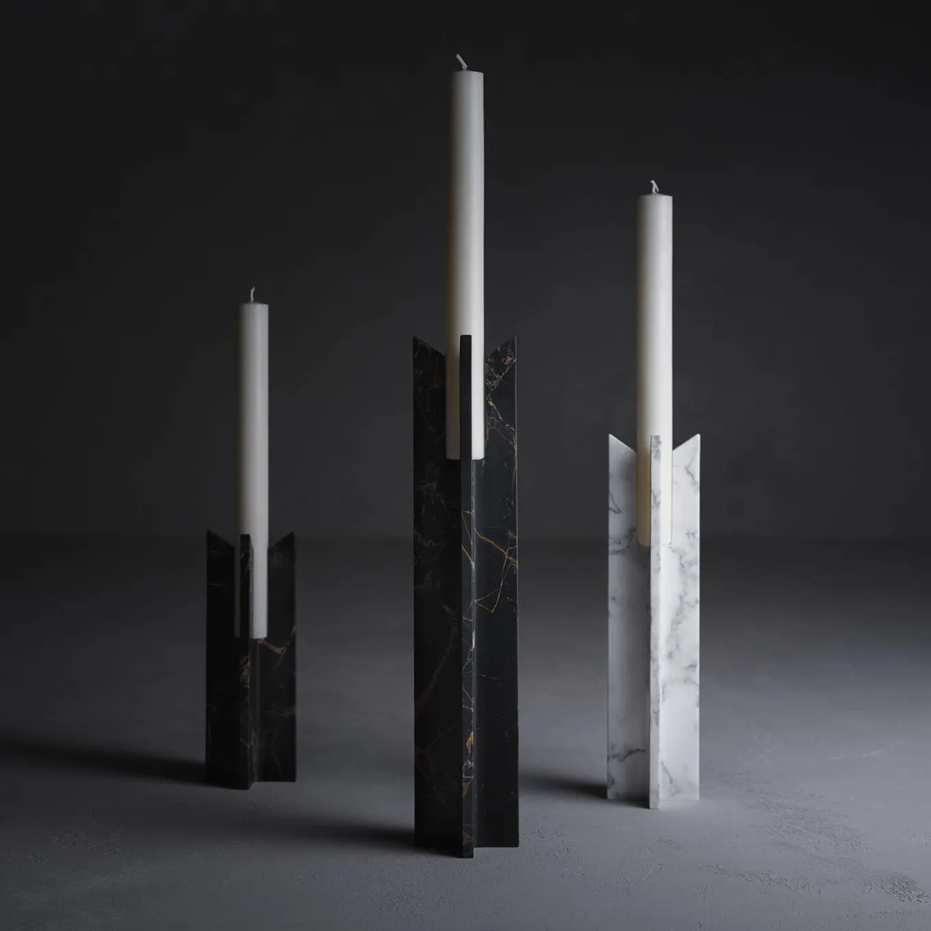 The Trinity collection transforms the cross motif into a refined three-dimensional form. Comprising candleholders in heights of 30, 40, and 60 cm, the base design fits within a square, with elements seamlessly connected through subtle radiused marble processing. Four natural stone components rise gracefully, featuring a diagonal cut to secure the candle. Ideal for residential or hospitality spaces, Trinity combines elegance and meticulous craftsmanship.