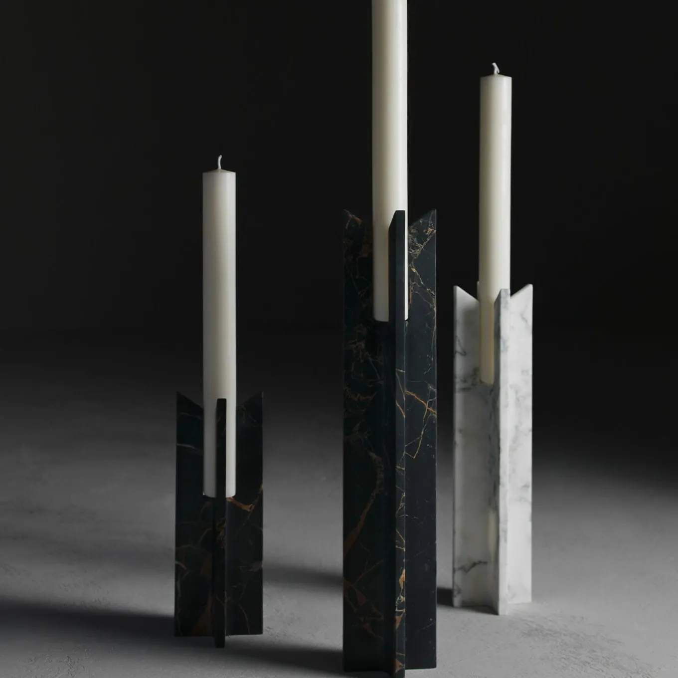 The Trinity collection transforms the cross motif into a refined three-dimensional form. Comprising candleholders in heights of 30, 40, and 60 cm, the base design fits within a square, with elements seamlessly connected through subtle radiused marble processing. Four natural stone components rise gracefully, featuring a diagonal cut to secure the candle. Ideal for residential or hospitality spaces, Trinity combines elegance and meticulous craftsmanship.