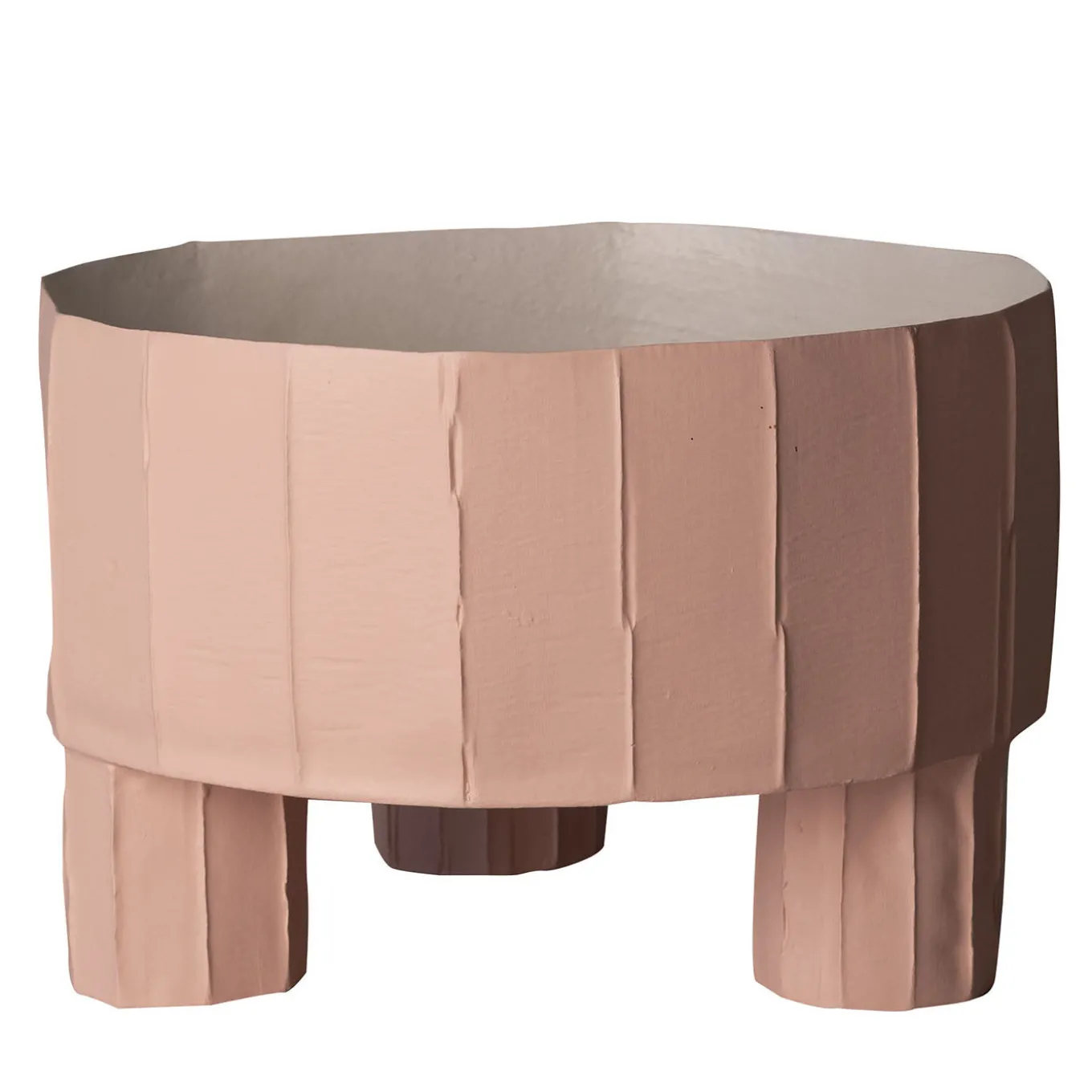 This centerpiece showcases a unique paper clay sculpture characterized by its soft cipria tone and textured, uneven surfaces that emphasize its individuality. Crafted through a meticulous process, each piece varies slightly in shape and size, underscoring its exclusivity. Its rounded form rests on three sturdy legs, creating an organic yet modern aesthetic ideal for distinctive interior displays.