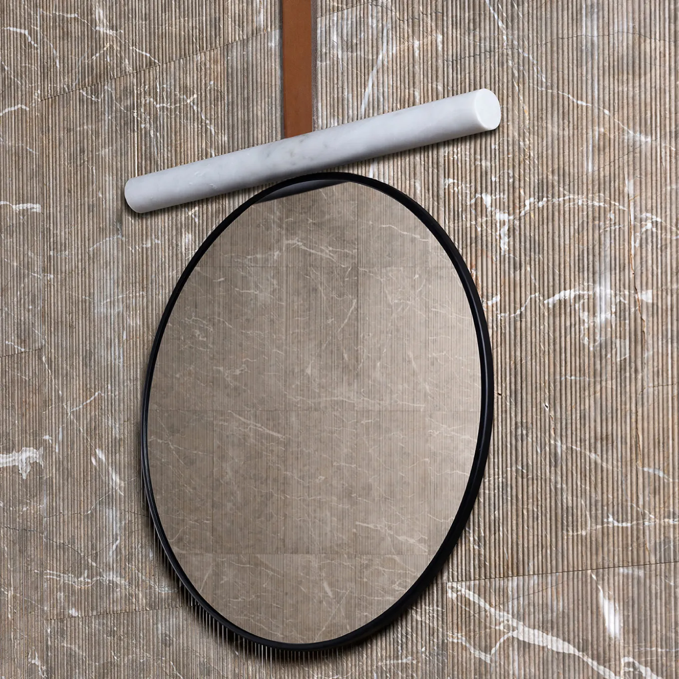 The Tube mirror features a refined tubular design that balances geometric elegance with material contrast. A horizontal marble element appears suspended by a leather strap, which also supports the round mirror beneath it. Its slim volume makes it well suited for both residential and hospitality environments where space efficiency is important. The mirror integrates seamlessly with related products in the tube system, offering a sophisticated solution that harmonizes light and space.