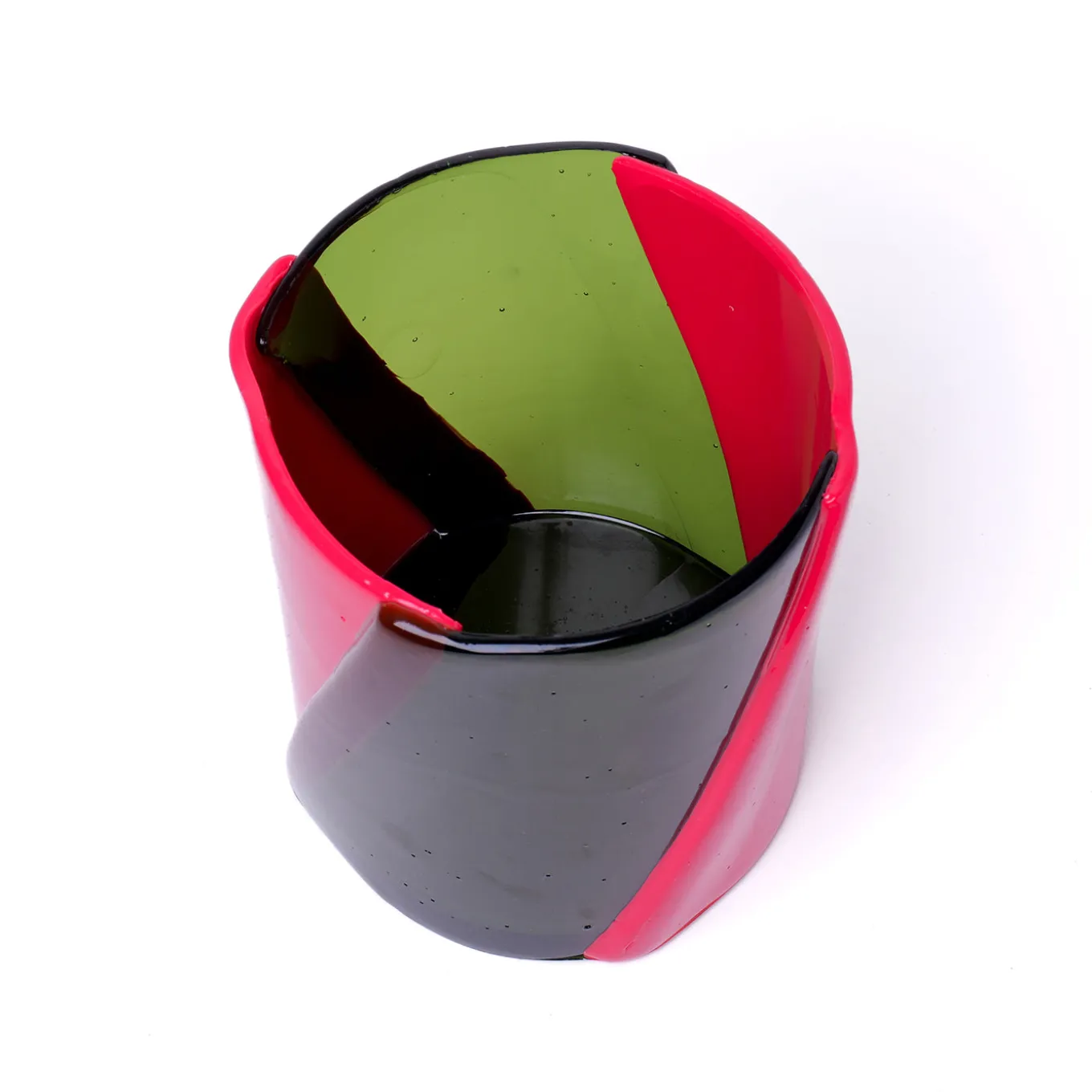 A decorative vase from the Lezioni by Enzo Mari collection, featuring a distinctive twirl design in green and fuchsia hues. Crafted in soft resin, the vase combines modern artistry with functional form to enhance contemporary interiors. Its sculptural silhouette and vibrant color blocking bring a dynamic visual element, making it suitable for showcasing floral arrangements or as an eye-catching standalone piece. Designed by Enzo Mari in 2011.