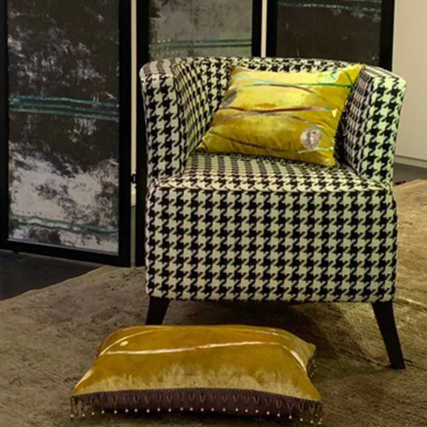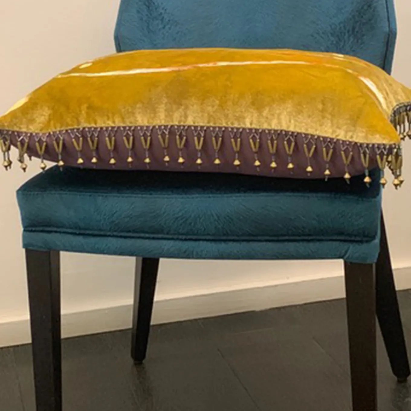 Delightfully artistic and beautifully luxurious, the silk velvet Two Fishes Cushion is dyed with yellow, gold and beige colors and hand painted with colored paste and gold leaf details. This deluxe cushion with a stunning design of two abstract fish features a trimming in glass beads and is complimented by a back in sumptuous purple silk.