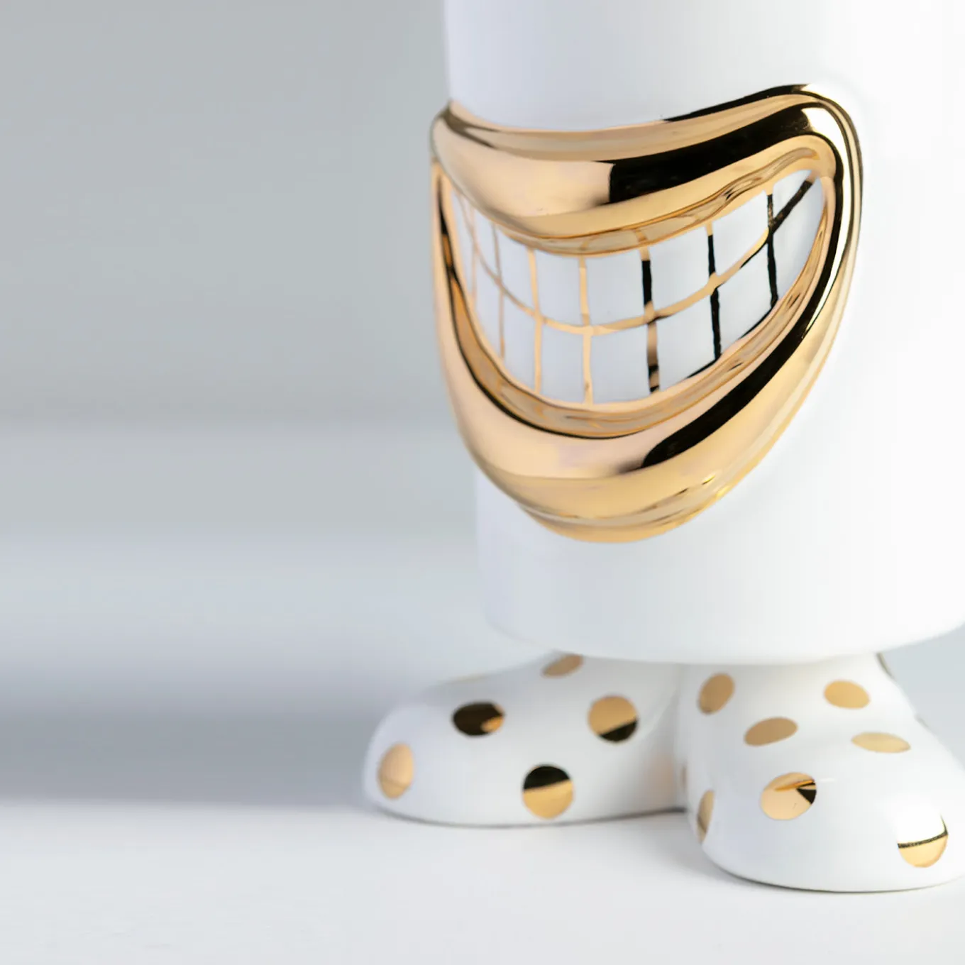 This exquisite multipurpose container belongs to an iconic series of amusing designs inspired by classic vintage toys. Deftly handcrafted and painted by hand in white and golden hues, its anthropomorphic silhouette is defined by overside anatomical details reminiscent of a whimsical caricature. Also available in a colorful version upon request to the Concierge.