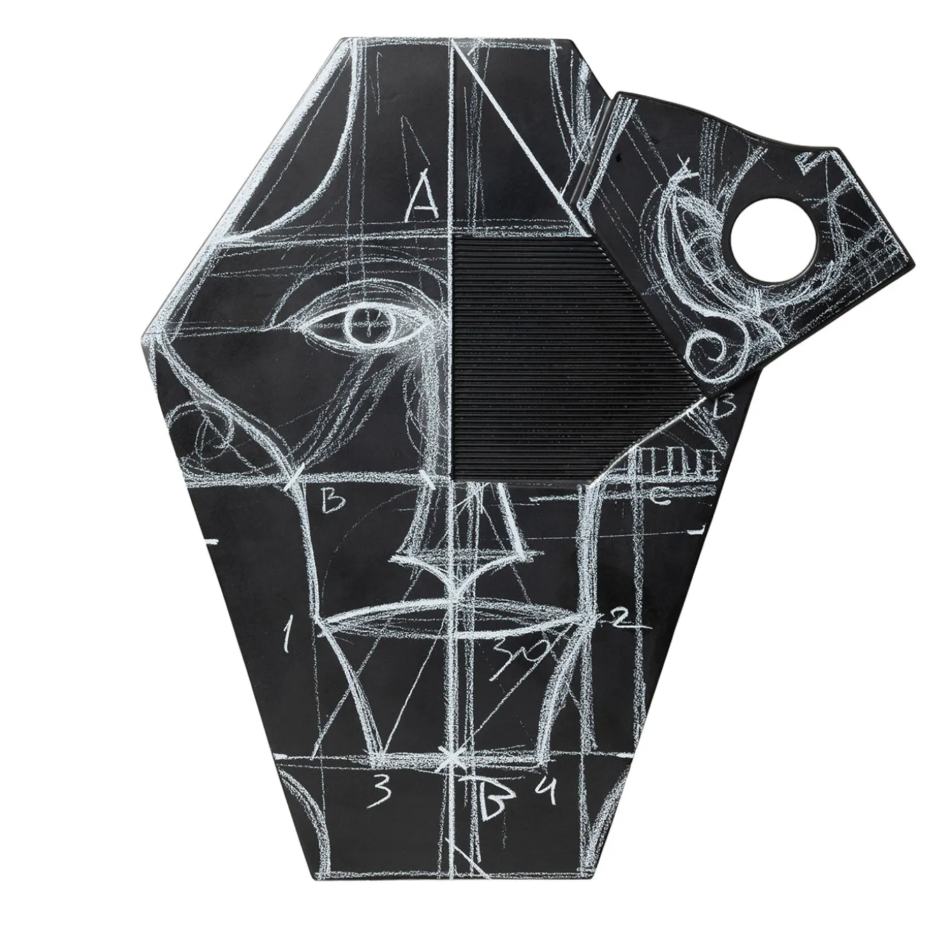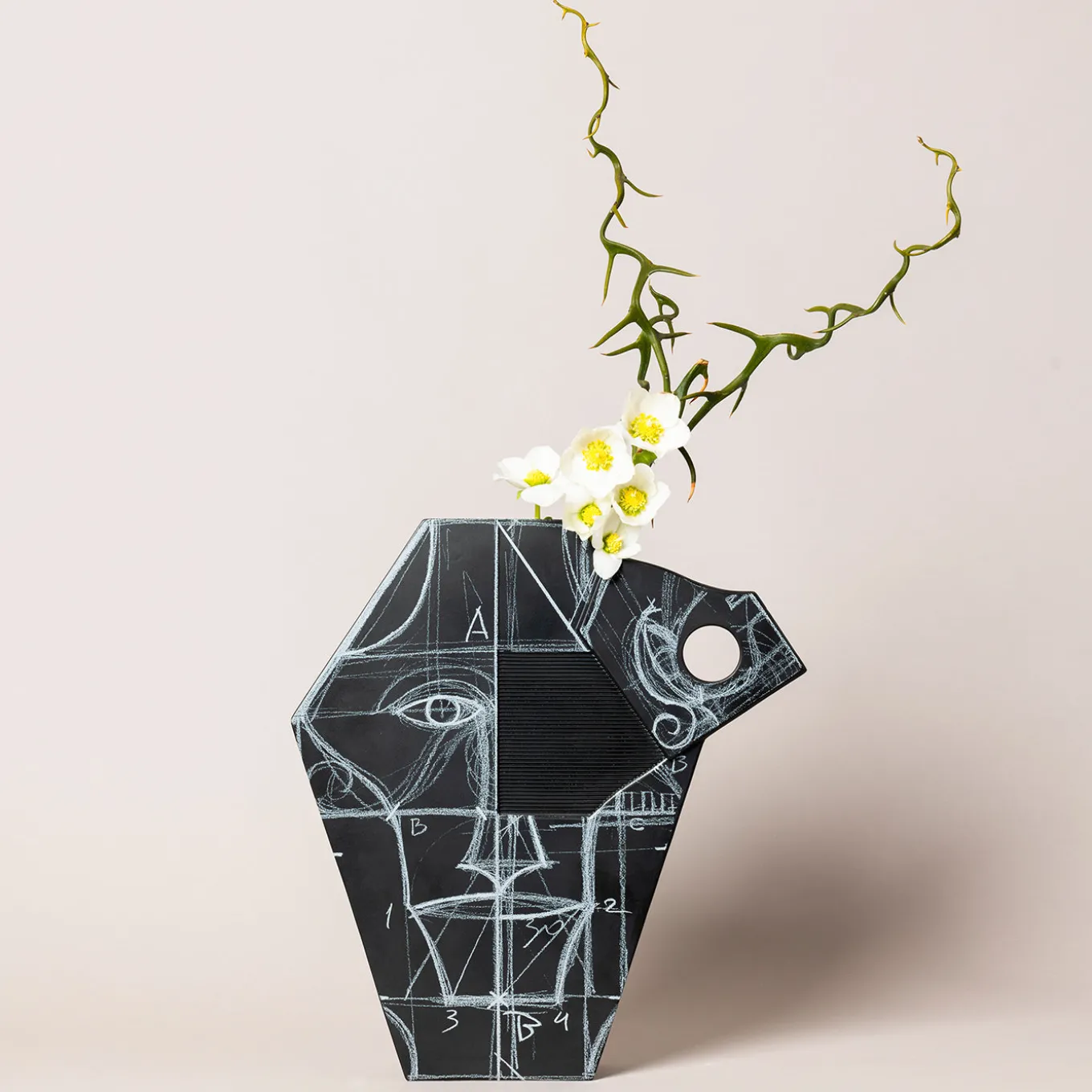 Ulisse is part of a unique collection of ten sculptural vases designed by Mimmo Paladino inspired by iconic figures from the Iliad and the Odyssey. This piece interprets the figure of the wandering hero through a striking sculptural form featuring dense graphic lines and labyrinthine motifs. Its black glazed surface with white serigraphic details evokes memory and identity in a continuous dialogue between presence and absence. The Ulisse vase merges mythological symbolism with contemporary artistic expression in a unique, evocative decorative object.