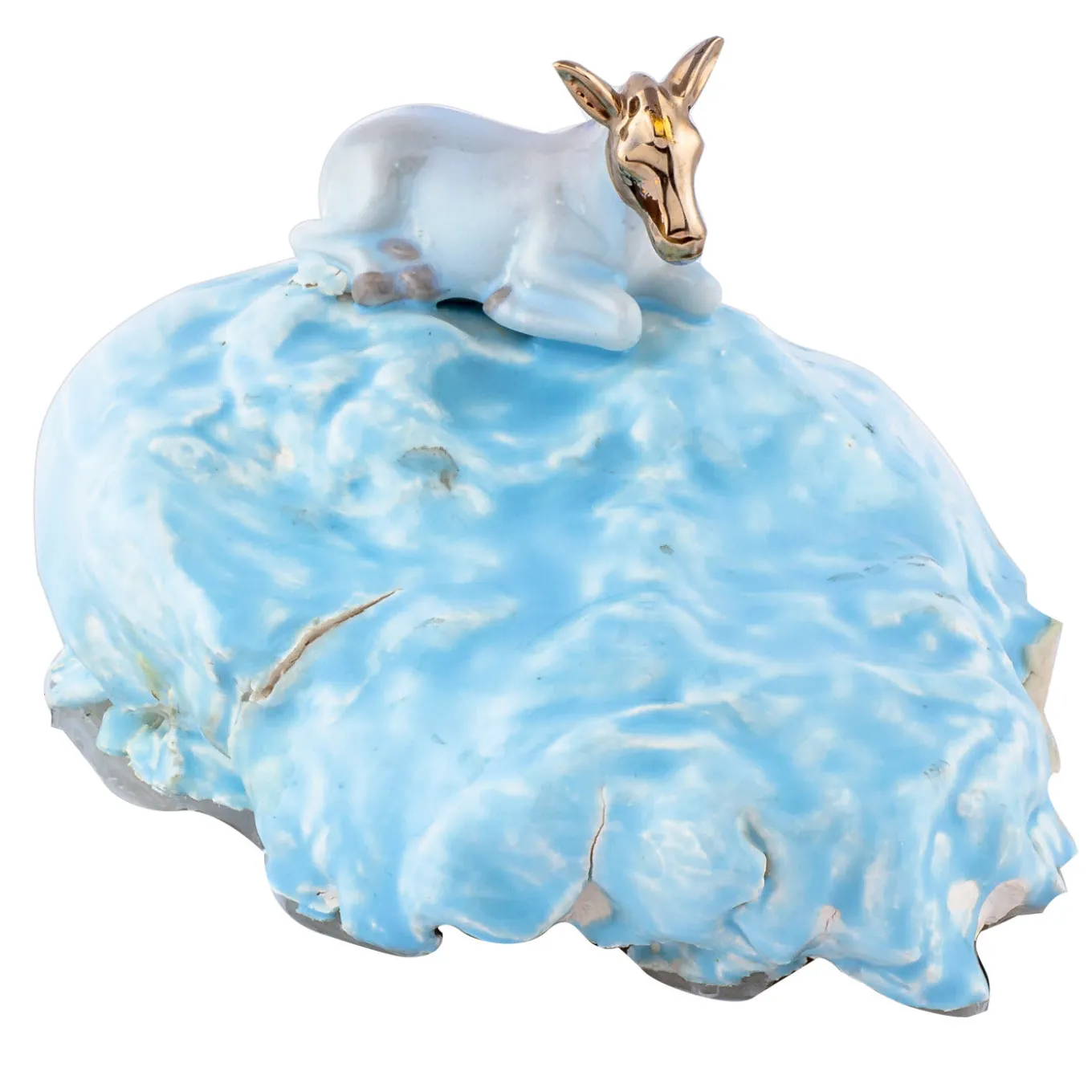 A fascinating centerpiece creates a bond between people, making a terrific talking point when dining with guests. These eccentric pieces are made in total freedom and experimentation, with the addition of silicone, crystals, porcelain animals and some small remnants from production. Here, a small animal rests on an ocean of light blue.