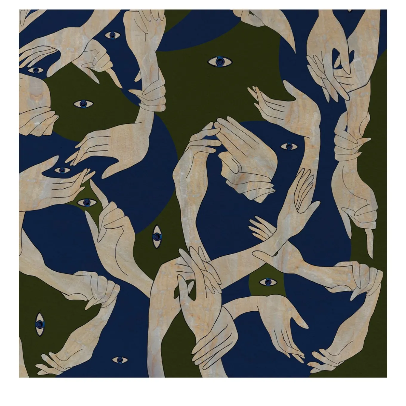 Here a myriad of hands interweave, giving life to a perpetual motion, which shapes a visionary world. Forms and colors play tricks on the eyes. The subjects are hands. Faces. The infinite metamorphosis is a constant surprise. There are so many points of view we can’t really know which one is reflecting reality. Mixtures of shades and graphic drawings are the stylistic base of this eclectic color mix and contrasting texture. The result is unprecedented surrealism.