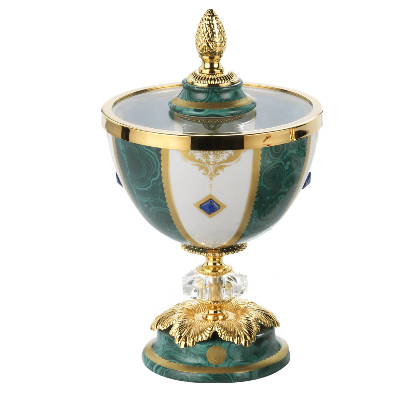 This magnificent box, with its classic shape and decorations, brings sophistication and timeless appeal to any decor. The fine porcelain of the piece and its lid are decorated with accents in pure gold, crystal, and brass.