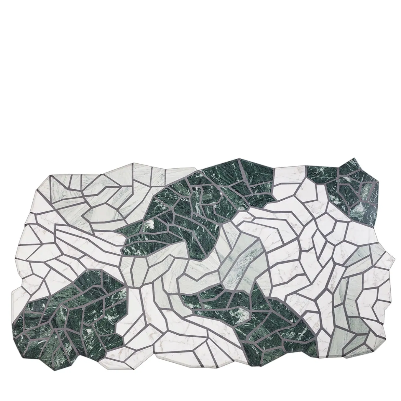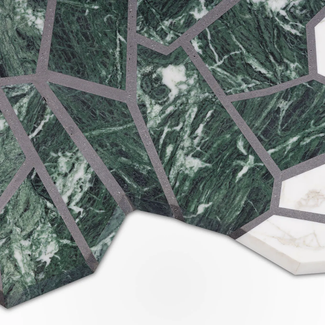 Cutting-edge technologies and a clever mix of materials define this eccentric rug inspired by Palladian floors. Designed by Studio Zanellato-Bortotto for exclusive contemporary homes, it features a honeycomb aluminum mesh onto which is fitted a mantle juxtaposing green Guatemala, Calacatta, and Cipollino marble inserts combined with concrete resins.