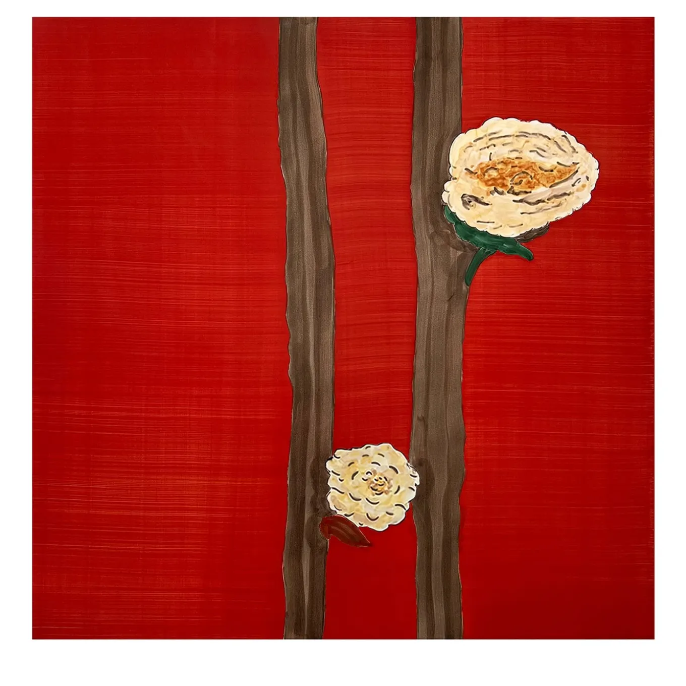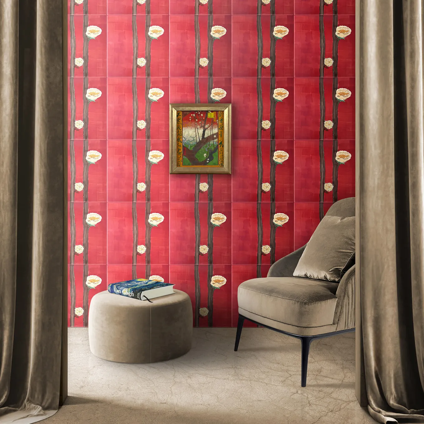 A captivating floral detail borrowed from the “Flowering Plum Orchard (after Hiroshige)” painting by Vincent van Gogh lends this precious ceramic tile its distinctive artistic flair. The daring use of red shades marking the original is here respected alongside minute details accurately capturing the painter’s vibrant aesthetic that he chose to reinterpret the poetic elegance of Japanese art tradition. The price is per square meter.