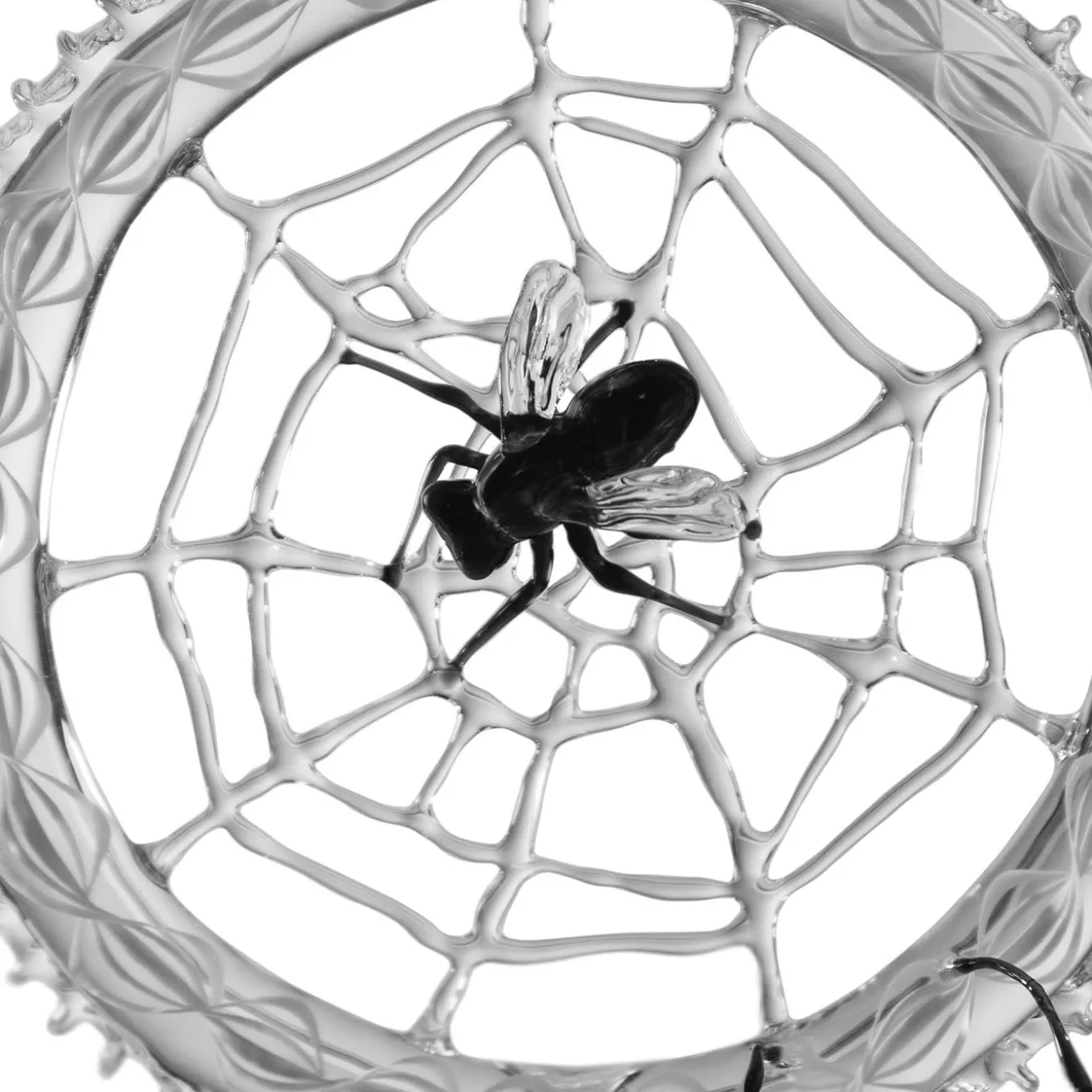 Vanità from the Façon De Venise Collection is a delicate glass sculpture featuring an elongated goblet with intricate patterns. The stem is adorned with a web and spiders, blending elegance with an eerie touch. These sophisticated glass objects embody the precariousness of existence and the relentless passing of time, evoking the concept of “l’infinita vanità del tutto” (the infinite vanity of the whole). Inspired by Giacomo Leopardi’s “A se stesso” from the “Amore e Morte”.