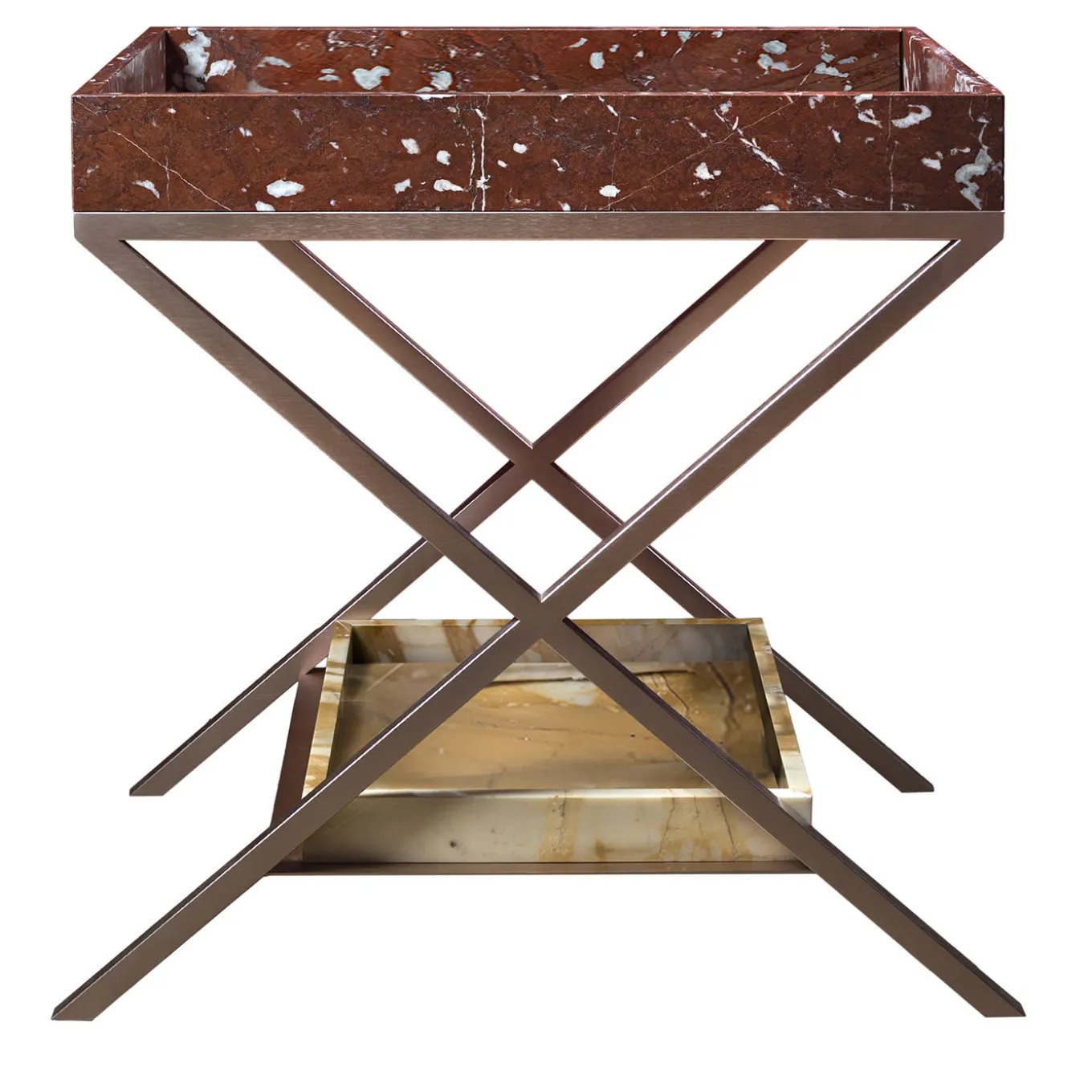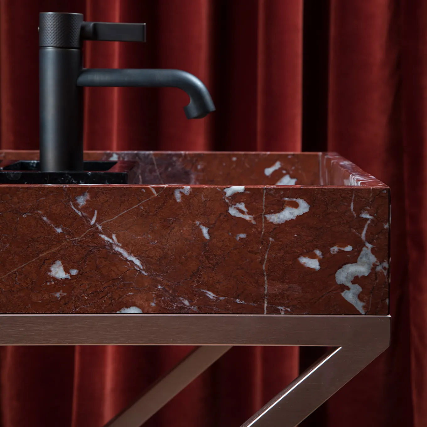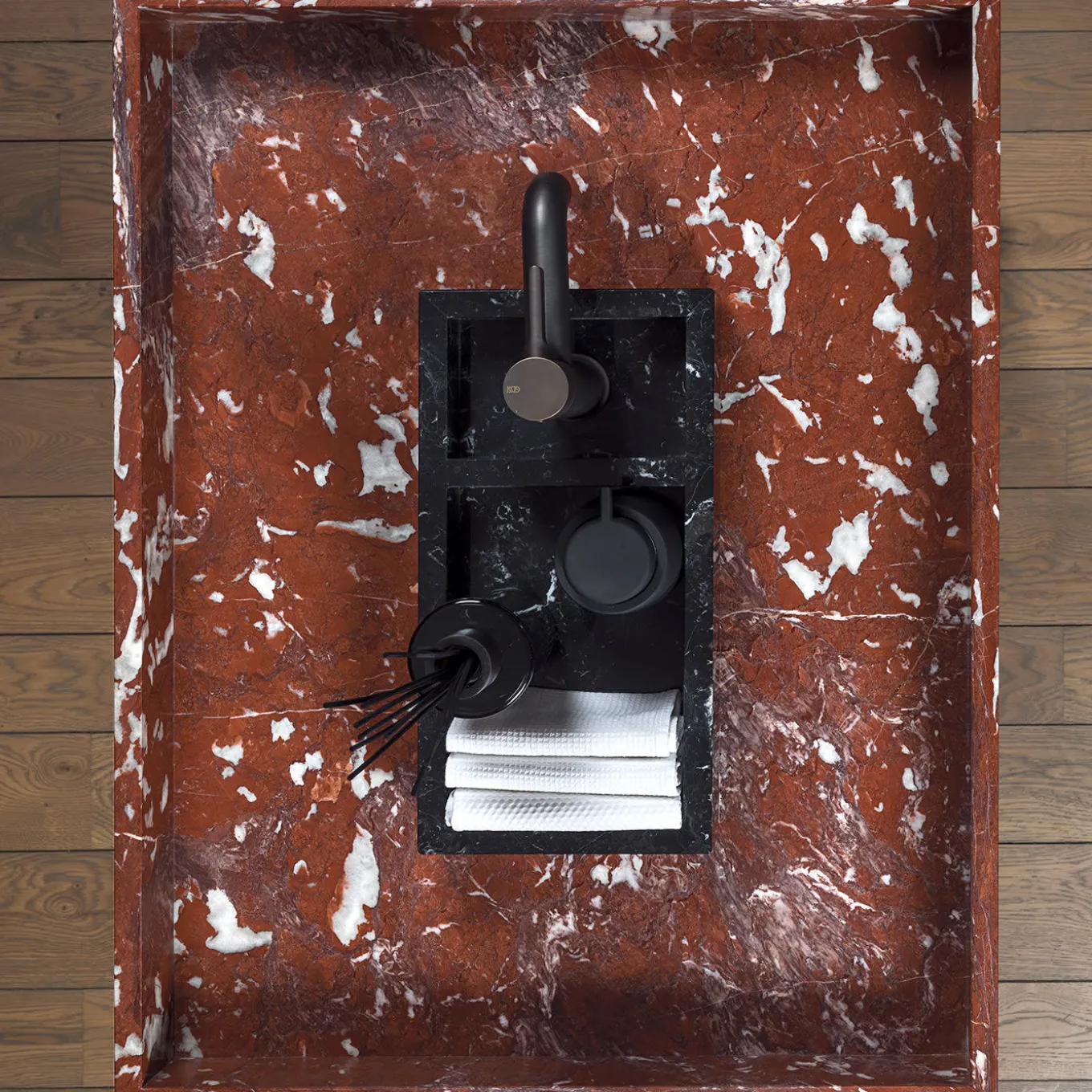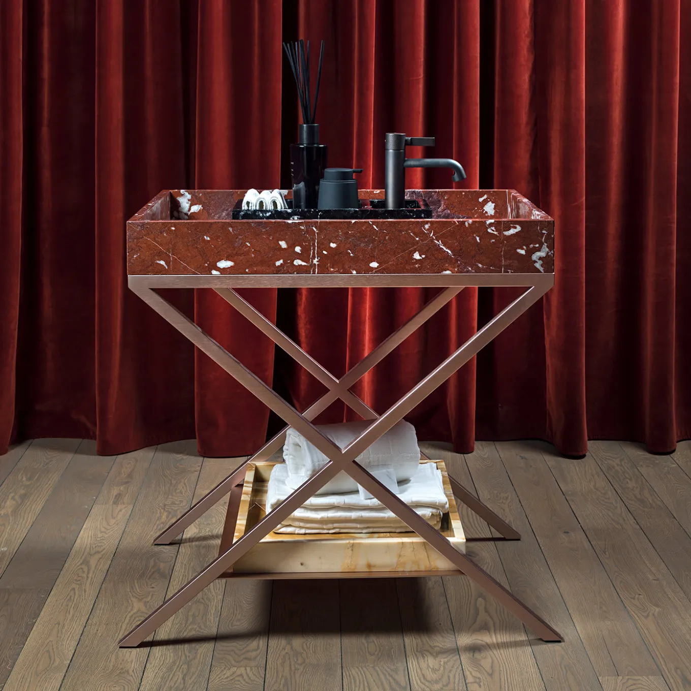 This extraordinary piece of marble craftsmanship and design is a unique objet d’art for any contemporary or traditional elegant bathroom. Showcasing an exquisite Rosso Francia large marble basin, housing three smaller inner trays in remarkable Nero Marquinia marble for face cloths and soaps. This gorgeous basin rests on a stunning satin copper finished metal pliant, that accommodates a functional yet singularly striking Giallo Siena marble tray for towel storage.