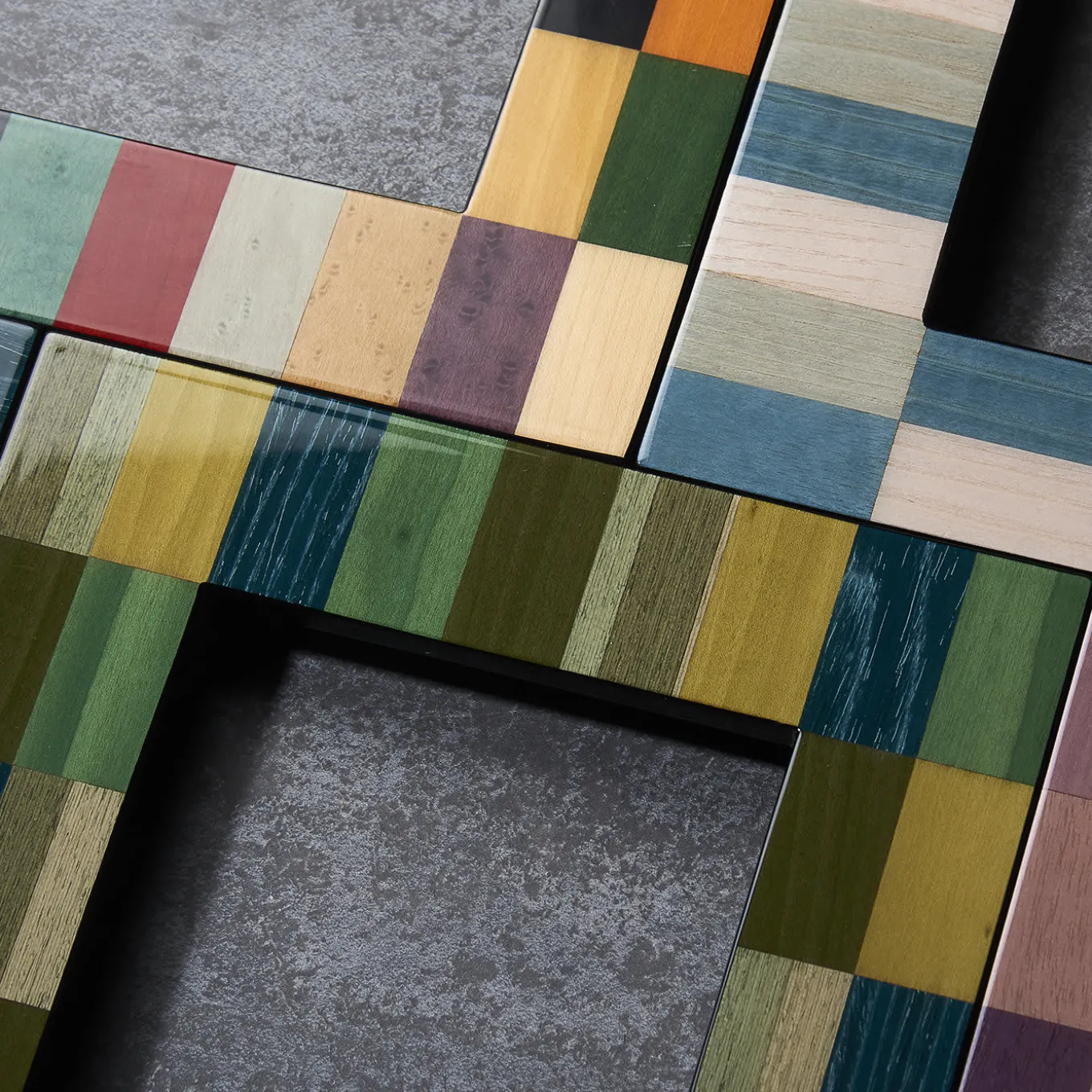 An original and stylish gift idea for a beloved one, this photo frame is part of the Venezia Mestre Collection of design objects characterized by modern art-inspired, geometric motifs. Entirely handcrafted of wood, it features a bold and captivating veneer made of inlaid rectangles boasting tones of yellow, green, and blue that will effortlessly match any style decor.