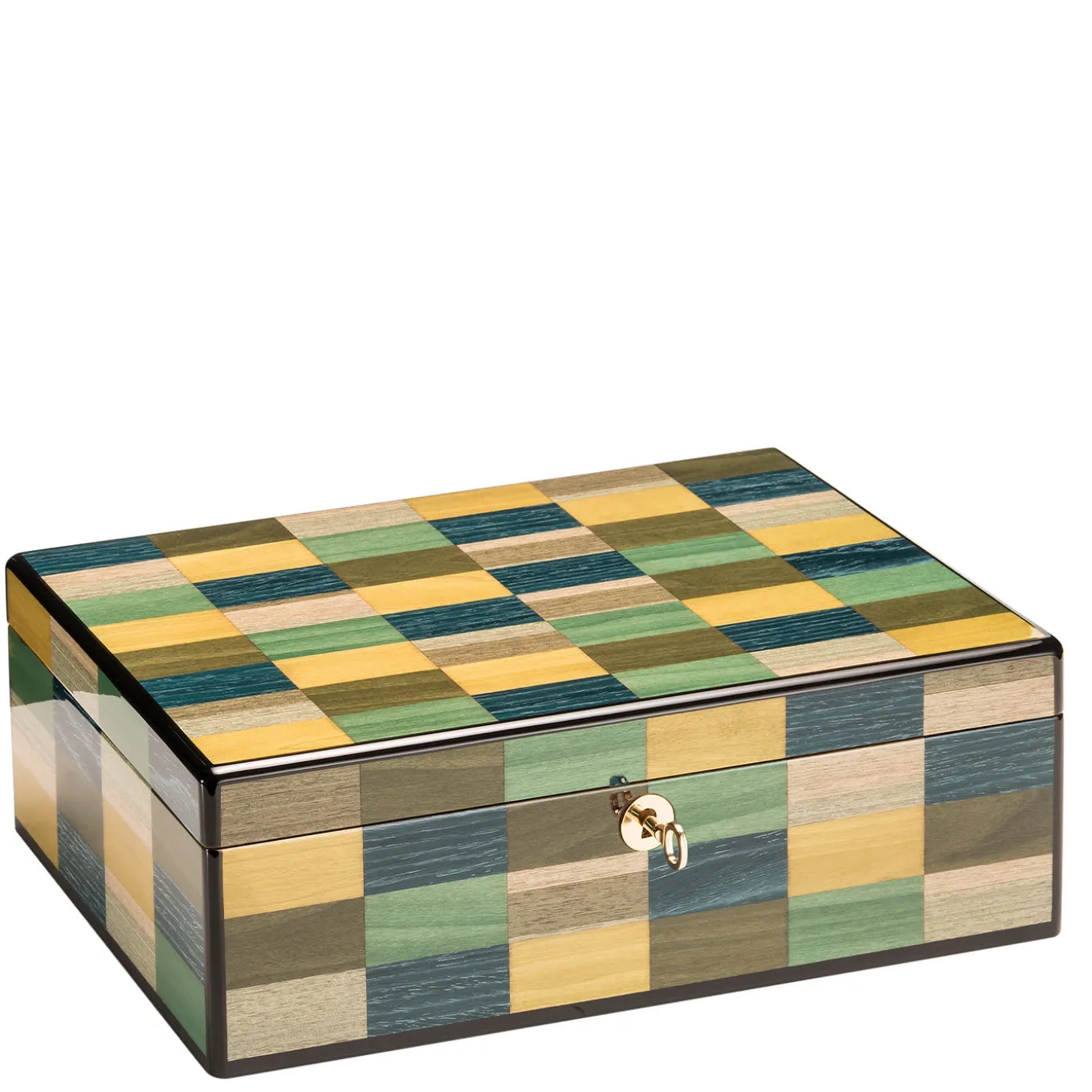 This splendid large box can be used to store up precious belongings kept safe thanks to a small key. Timeless and versatile, it is handcrafted of mahogany wood veneered with geometric inlaid rectangles enhanced with muted, earthy shades of blues, greens, and yellows. Enriched with gold-finished-metal, this box is lined with beige Alcantara.