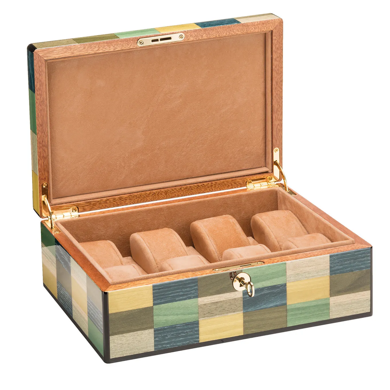 Ideally combined to the jewelry box from the Venezia Mestre Collection, this watch case will make a bold and refined statement in any style decor. Masterfully crafted and veneered by hand, it is fashioned of mahogany wood enriched with an inlay work of a series of yellow, blue, and green rectangles lending it a modern charm. Enriched with gold-finished metal details, its internal structure stores up to eight watches and is upholstered with beige Alcantara.