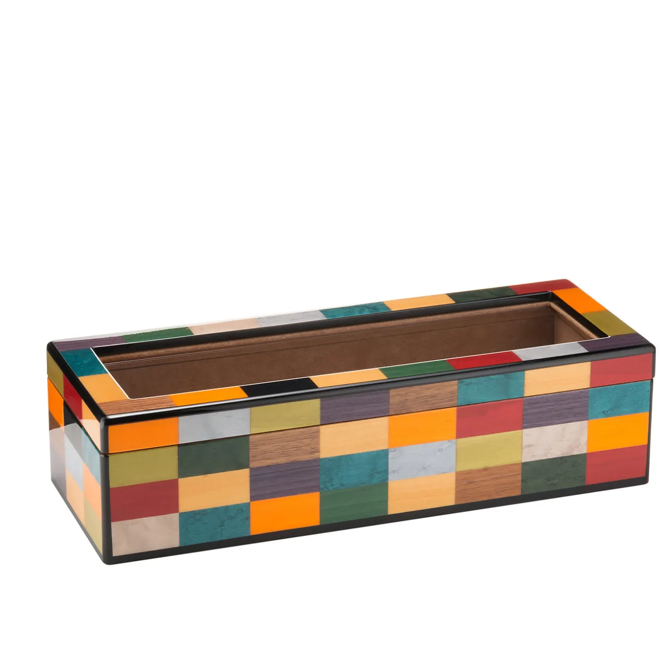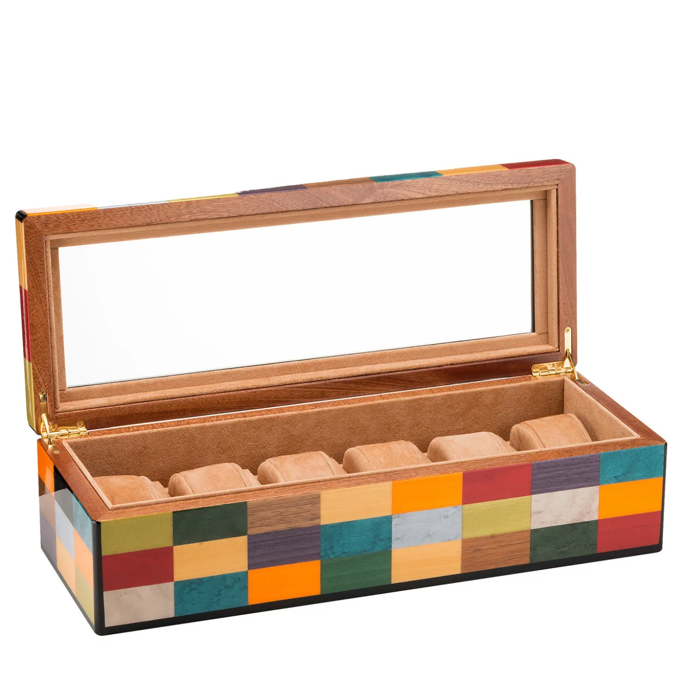 A superlative showcase of craftsmanship, this watch case will be an original addition to any bedroom vanity, especially when displayed with the Venezia Rialto Jewelry Box. Fashioned of mahogany enriched with an inlay veneering of colorful rectangles enhanced with a brushed and polished finish, it is lined with beige Alcantara and enriched with a mirrored glass on the inner top. Storing up to 6 watches, it is enriched with gold-finished metal details.