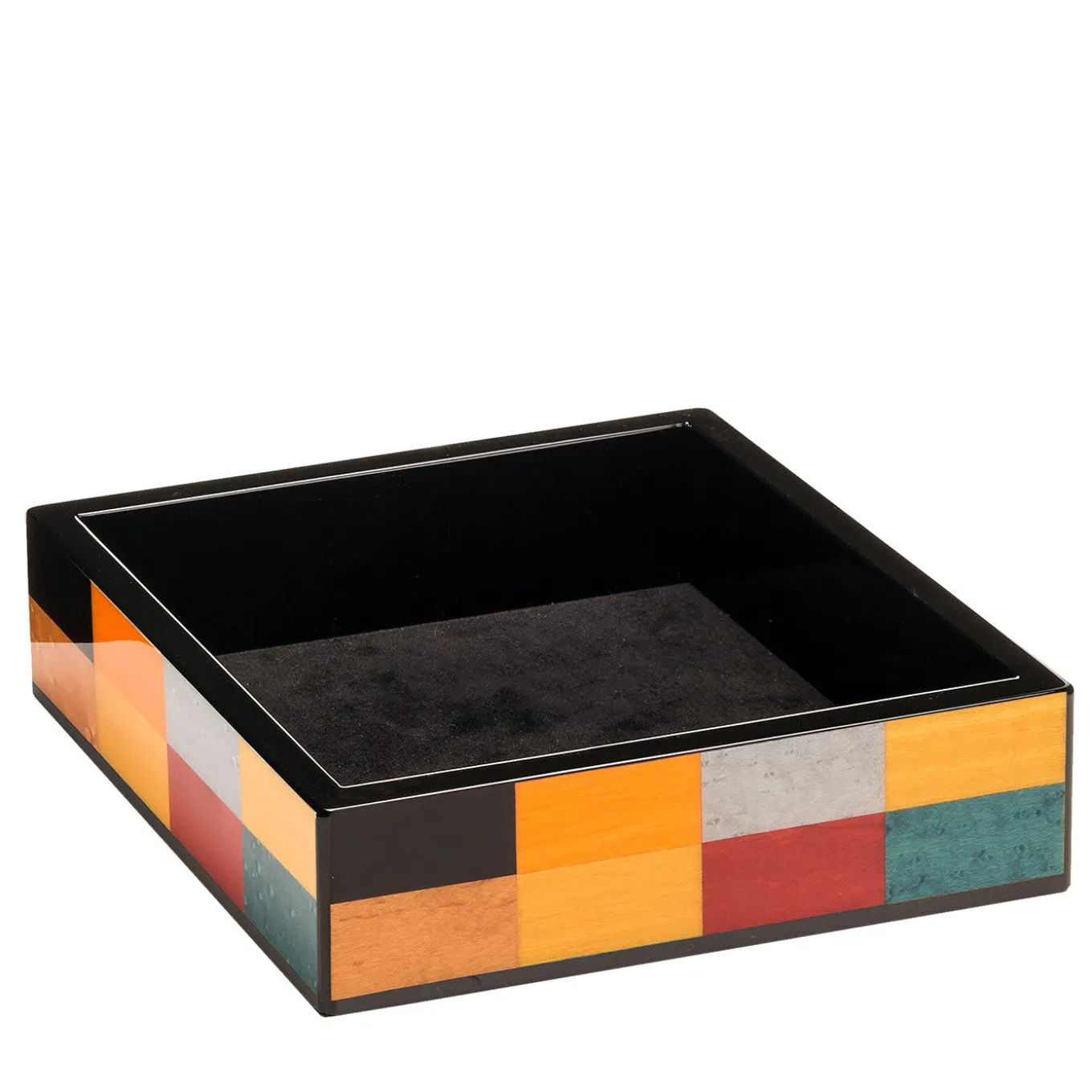 An exquisite objet d’art that will add a lively dash of color and elegant flair to a modern entryway console, this vide-poche (from the French meaning literally “empty-pocket”) combines art and design in its simple wooden silhouette. Distinguished by a handmade inlaid work of rectangles boasting polished and brushed vivid colors, it is lined with soft black Alcantara for a sublime finish.