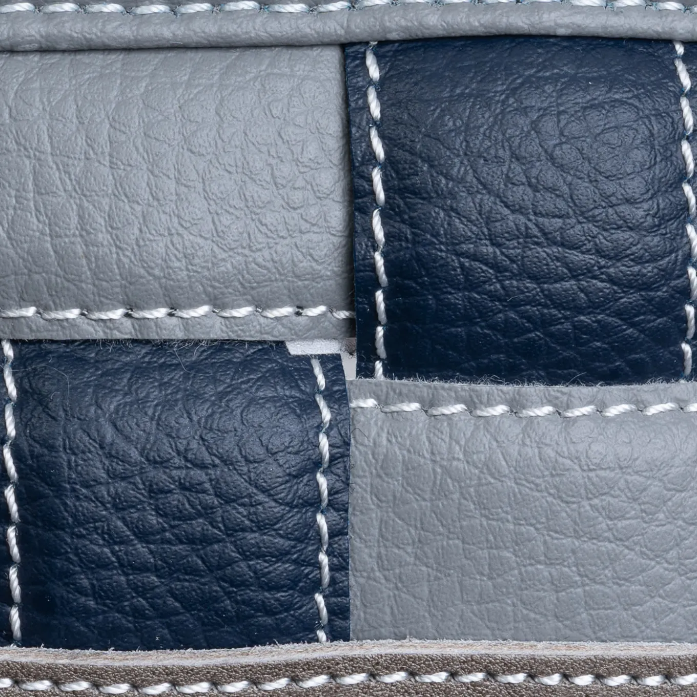Gathering coins or keys without renouncing exclusivity is what this precious vide-poche offers thanks to its distinctive sartorial allure. Faux leather bands in gray and blue are knotted together for an intriguing texture further enhanced by its chromatic scheme. Contrast stitching reinforces the general artisan value while the inner rigid bottom ensures impeccable stability and resistance. Different versions are available.
