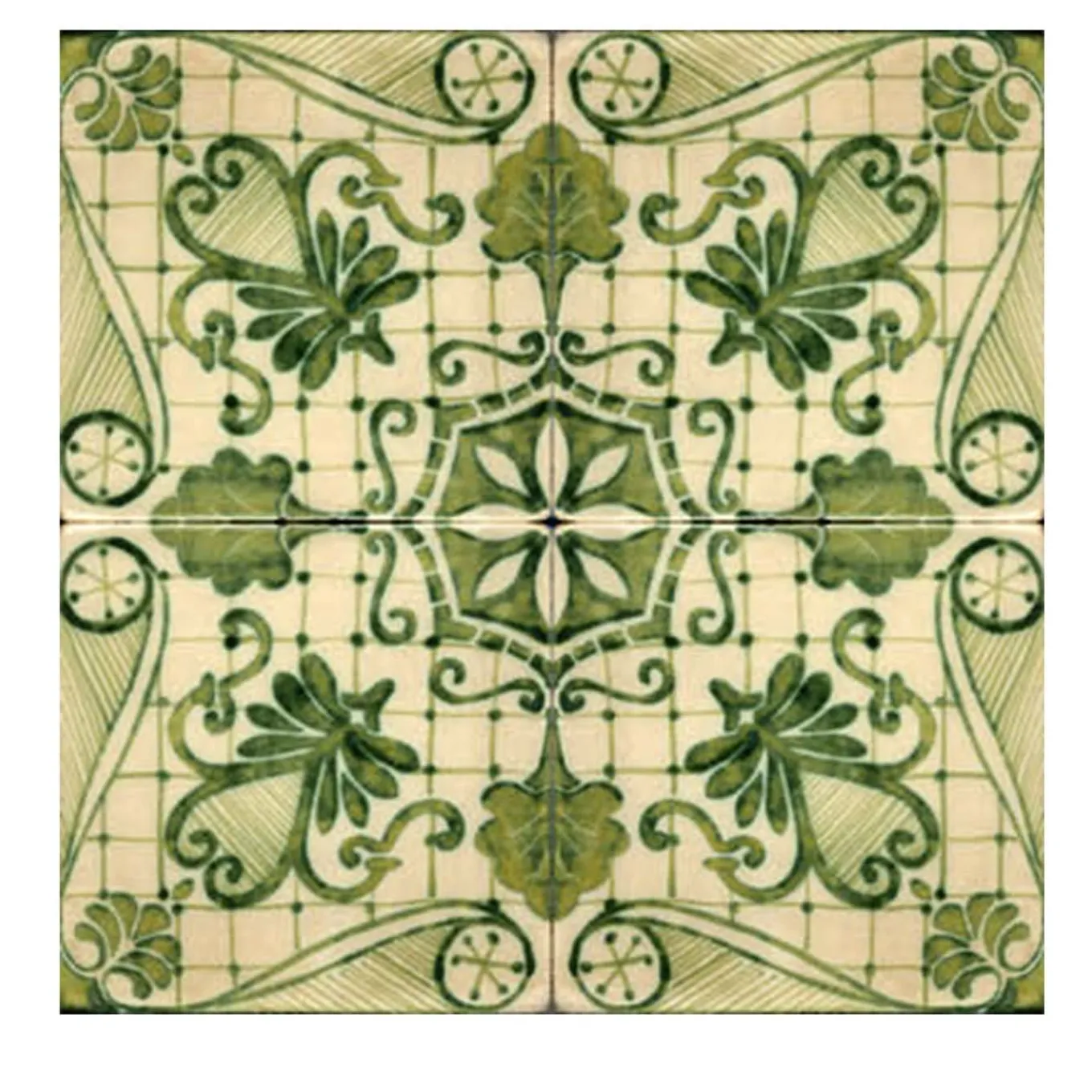 Marked by a striking array of forms and colors, this set of majolica tiles will provide a superb accent in a modern or rustic kitchen, bathroom, or dining room decor. Painted and glazed exclusively by hand, these tiles merge to reveal intricate design inspired by Sicily’s Moorish art influence. Meticulously detailed in a moss-green paint, the design features frond motifs on an ivory background with a sinuous, bell-shaped frame. A subtle grid in the background enhances the geometric balance of the piece. In a kitchen or bathroom, these tiles will age gracefully due to their protective glaze.