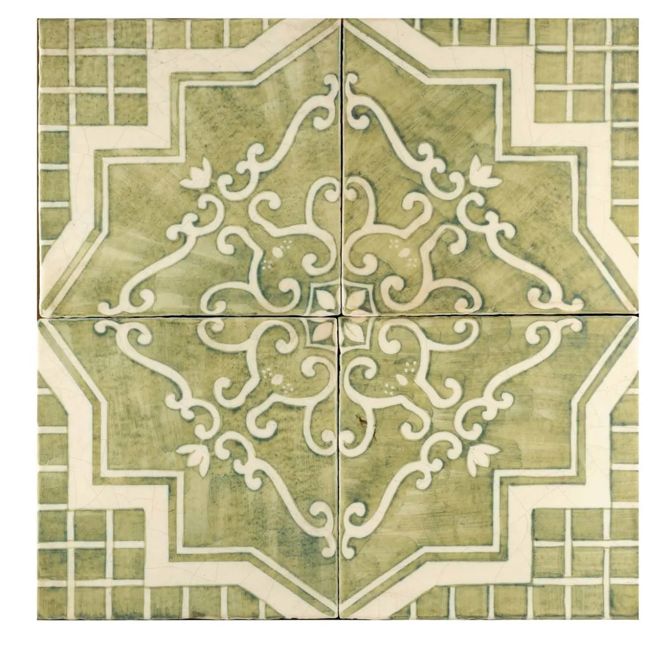 There is more than meets the eye with this sublime majolica tile fashioned by Studio Le Nid’s skilled artisans. Hand-painted and glazed, these tiles are crafted with a mix of terracotta and ground volcanic stone and feature an intricate design revealed when combined in a set of four. Set on a moss-green background, the design is dominated by central frond-like motifs in ivory framed by a bold double border. The ivory grid highlights the both the sinuous contours and geometric precision of the piece. In a kitchen or bathroom, these decorative tiles will bring elegance and history into any home.