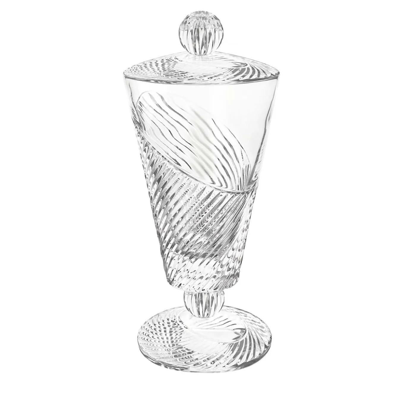 Part of the Vertigo collection, this vase with lid was crafted of transparent glass and features a footed shape and a conical bowl. The smooth surface of the piece is adorned with an etched decoration that boasts a dynamic tension thanks to a series of irregular lines running diagonally, enclosed in gentle curves. This enlivening object of functional decor can store and display a variety of trinkets, and can be paired with other items in the same series for a complete look.