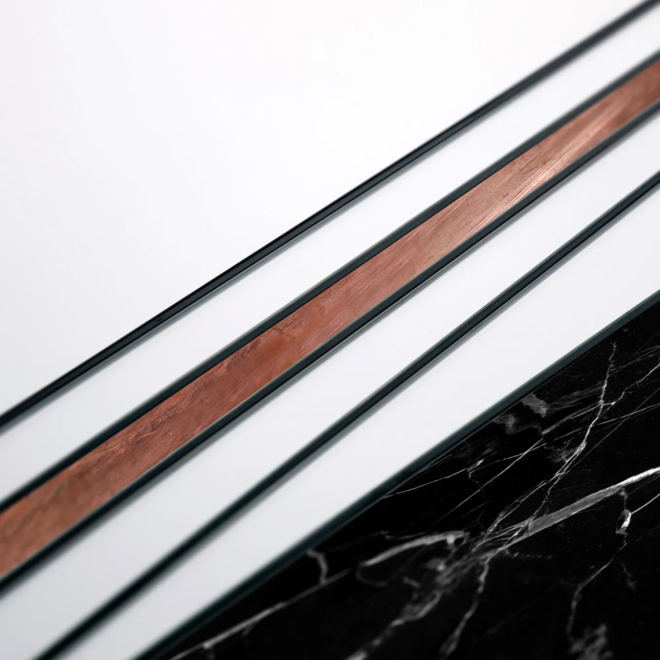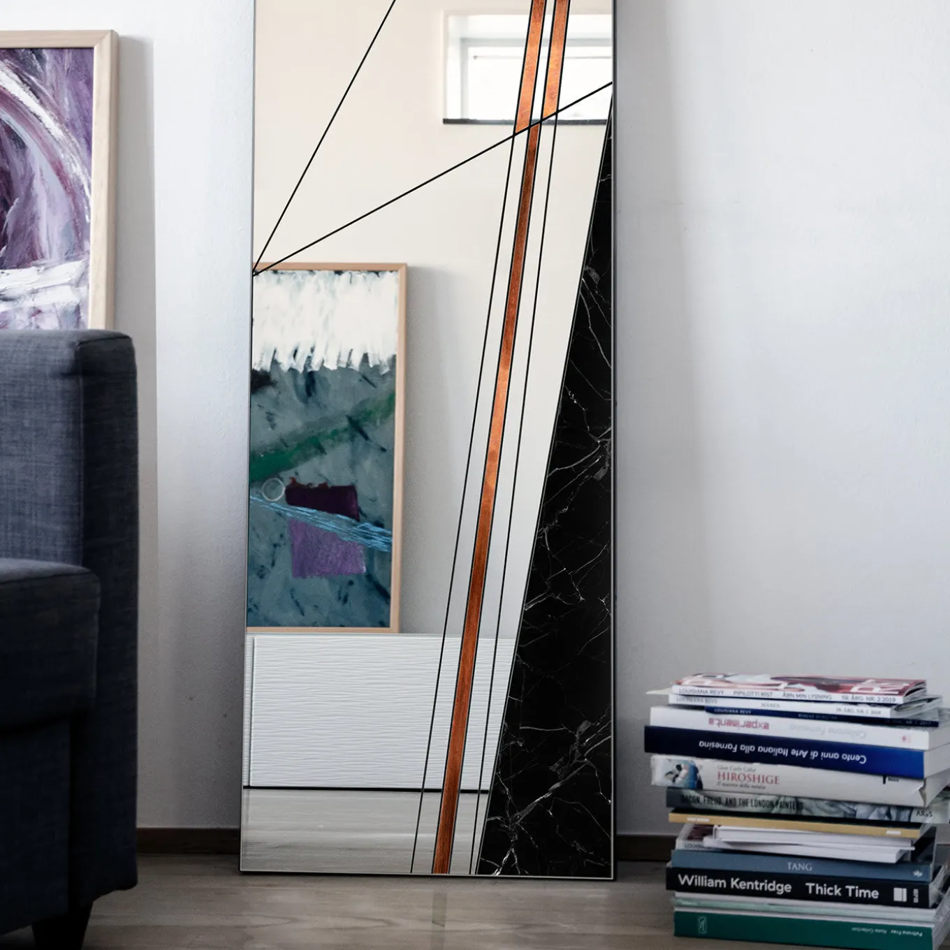Placed in a contemporary entryway, bedroom, or living room, this exquisite floor mirror will make a statement, thanks to its expert hand-craftsmanship, use of elegant materials, and minimalist design that abstractly recreates the network of ancient Roman roads. The rectangular wooden structure supports a series of mirrored glass elements joint within an aluminum trim, with the addition of a brushed copper insert and a black Marquina marble triangle.