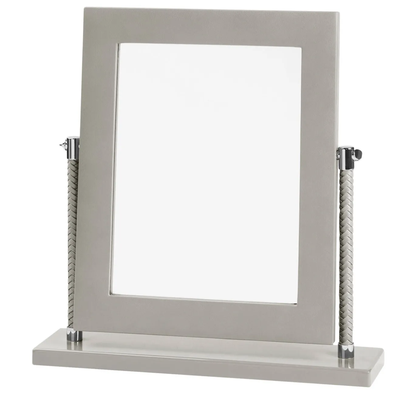 Leather vanity mirror with lacquered base and chrome or gold details. This piece is the epitome of functionality that perfectly blends with aesthetics: is characterized by a sophisticated and simple line, and it is fit for any interior style. Use it as the ideal complement for a dressing table in the bedroom, on a bathroom counter, or a console in an entryway.
