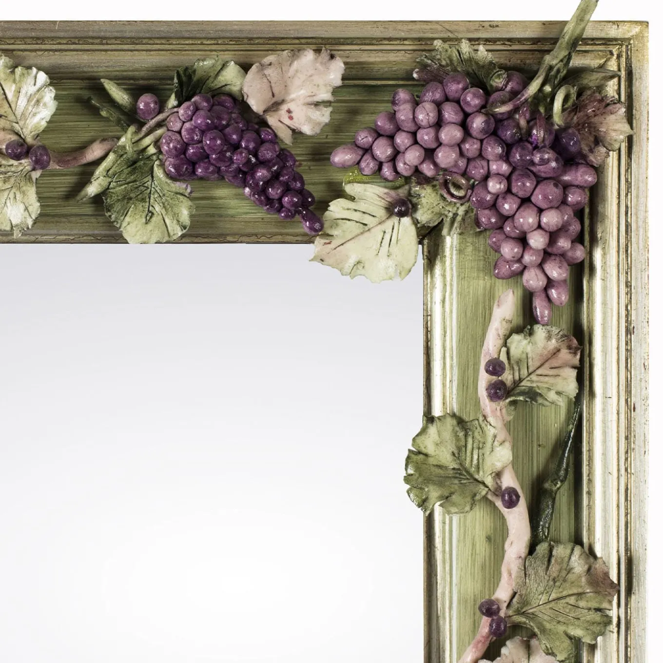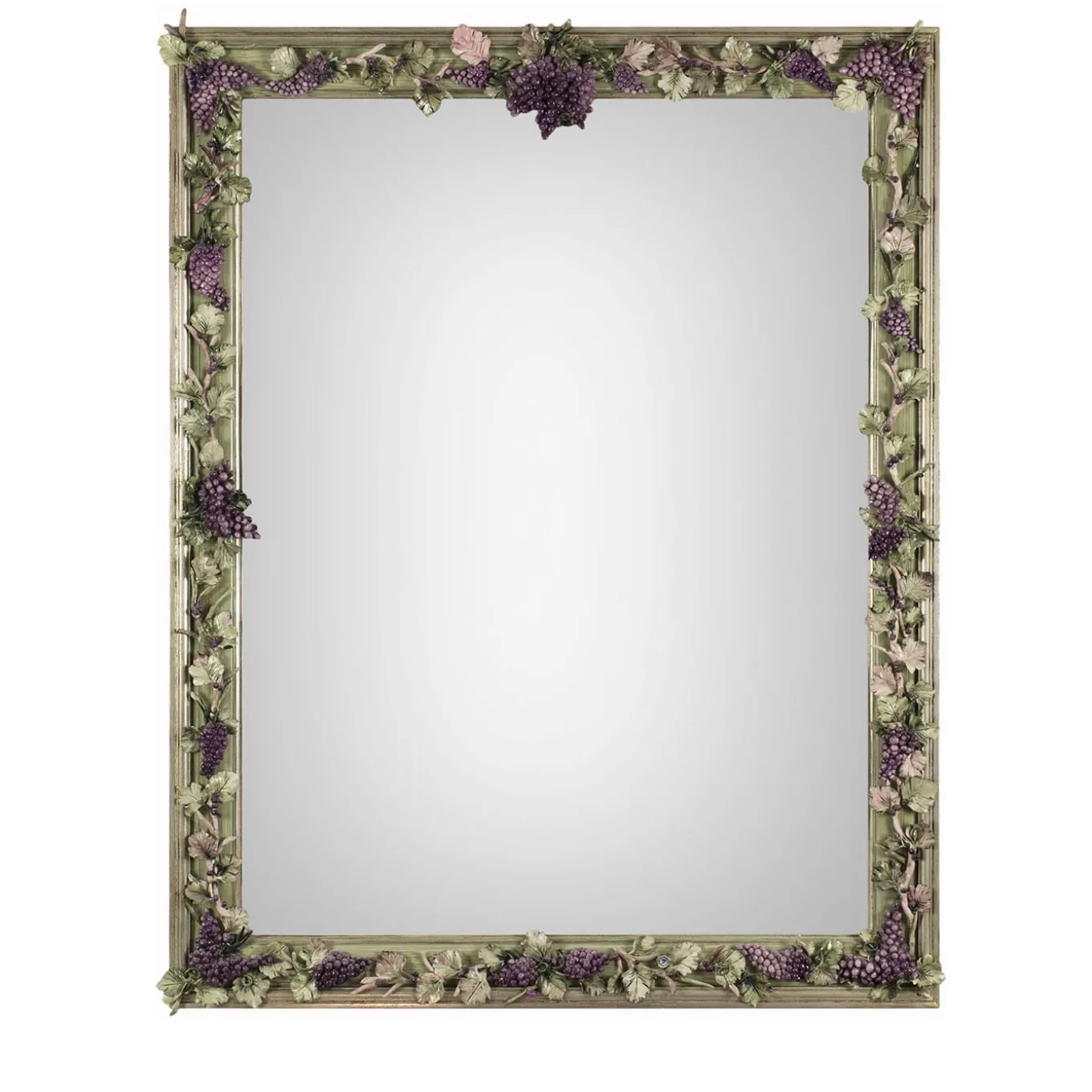 A rectangular wall mirror featuring a green lacquered frame with a mecca silver leaf finish that offers a subtle antique glow. the frame is decorated with clusters of hand-modeled and hand-painted grapes and vine leaves in fine Capodimonte porcelain, enhanced by a third-firing technique for durability and detail. This piece complements classic and country-chic interiors, combining decorative artistry with functional design. Custom sizes available upon request.