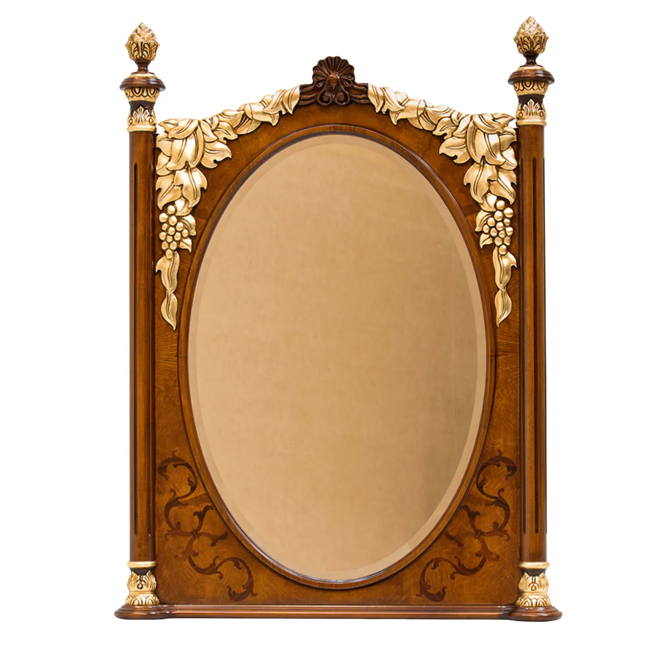 A triumph of fancy, precious decorations, and prized woods, this stunning oval wall mirror was designed to specifically complement the Bianchini’s vanity desk. The oval mirror is set into a rectangular wooden frame veneered in a combination of rosewood, feathered ash, and walnut briar flaunting subtle inlays. The organic carved decorations adding depth and artistic value to the piece are covered with luminous gold leaf.