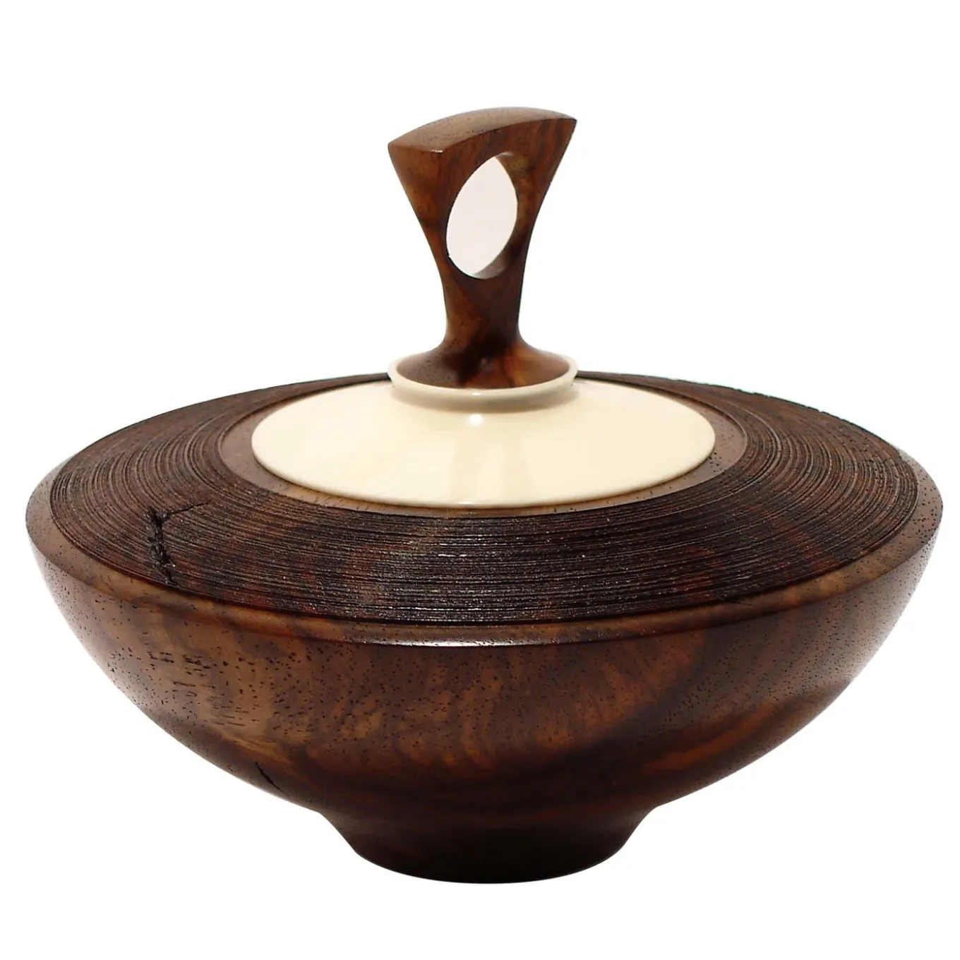 The classic shape of this exquisitely crafted bowl is designed to hold precious items or simply be displayed as a stunning artwork. Evocative of ancient vessels, the round walnut wood bowl showcases the tan background with rich chocolate-brown curly pattern. Perfectly balanced on the lid enriched with a silky ivory Galalith insert, the geometric knob of walnut briar adds a sophisticated and unique touch to this precious object.