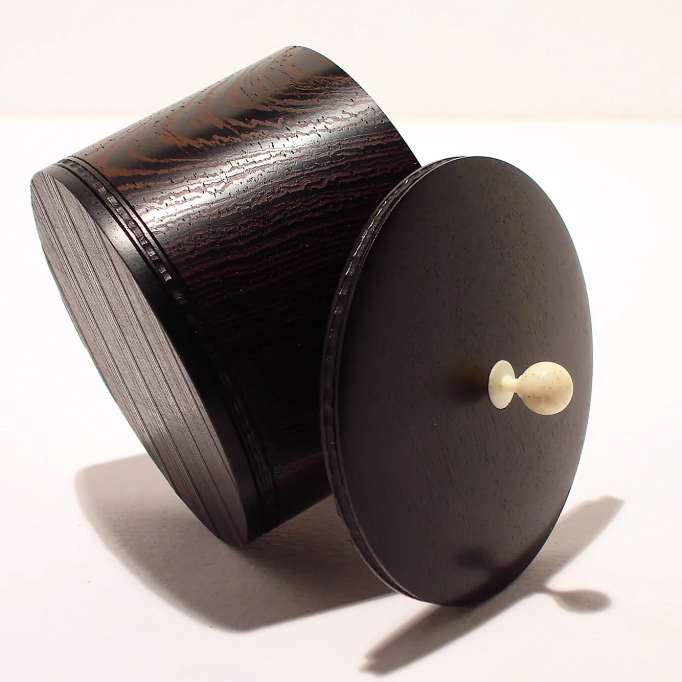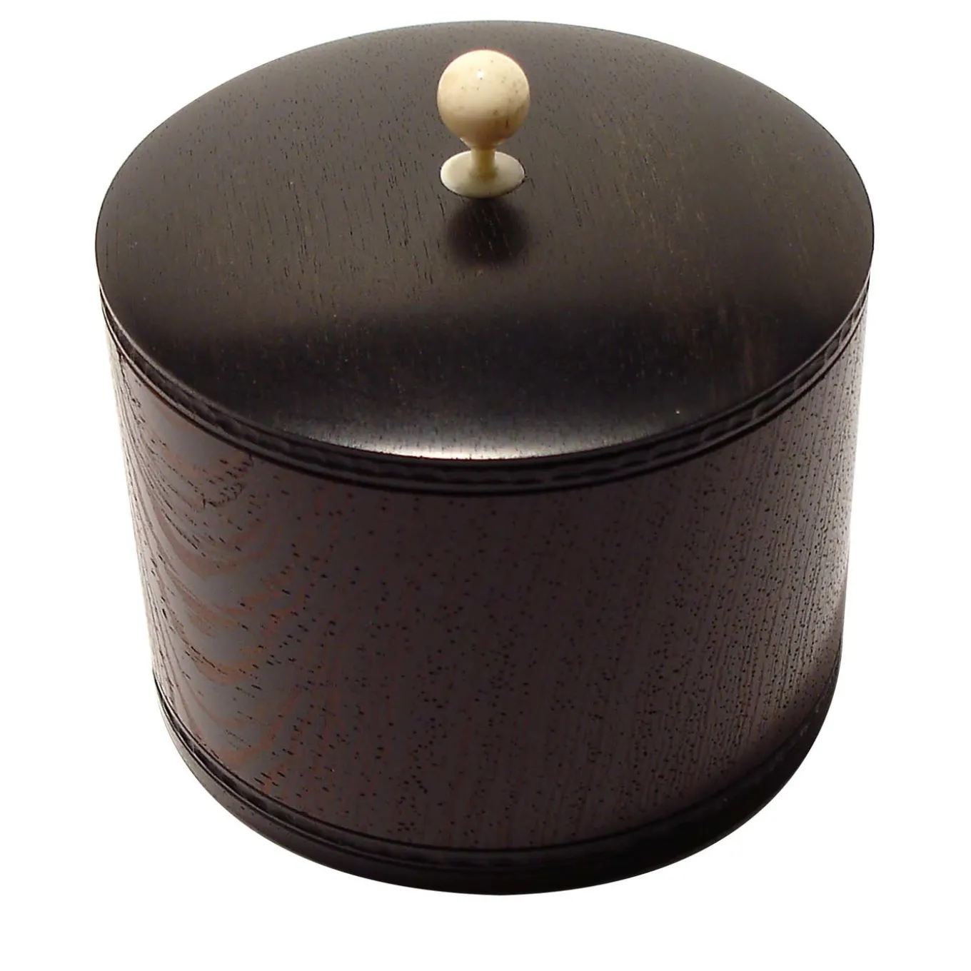 Elegant in it simplicity, this box features a stunning combination of the streaked dark-brown nuances of the wengè body and the jet-black color of the Camerun ebony lid and base. The perfect place to store precious objects on a vanity or dresser, this exquisite piece is crafted on the lathe and polished to perfectly join the two parts in a seamless shape that showcases the unique texture of the prized woods. The lid is embellished with a small spherical knob made of genuine bone.