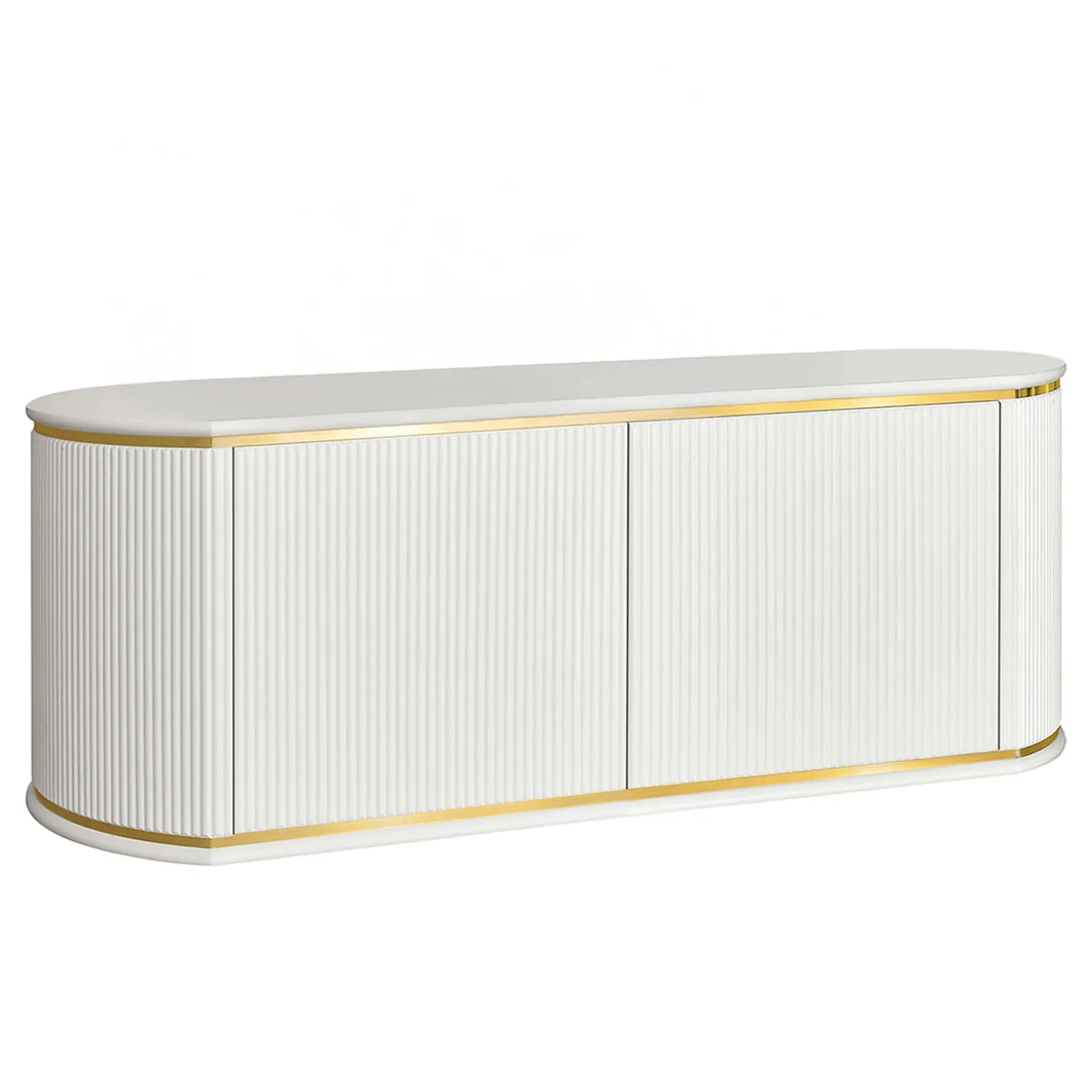 Masterful craftsmanship defines this suspended bathroom cabinet, where form meets function in a refined design. Featuring two push-pull doors, the ribbed canneté detailing adds texture and depth, complemented by gilded metal profiles for a touch of elegance. Crafted in polished white wood, it enhances modern bathrooms with a sleek aesthetic. Sink and tap not included with purchase, this piece offers discreet storage while serving as a sophisticated focal point in contemporary interiors.