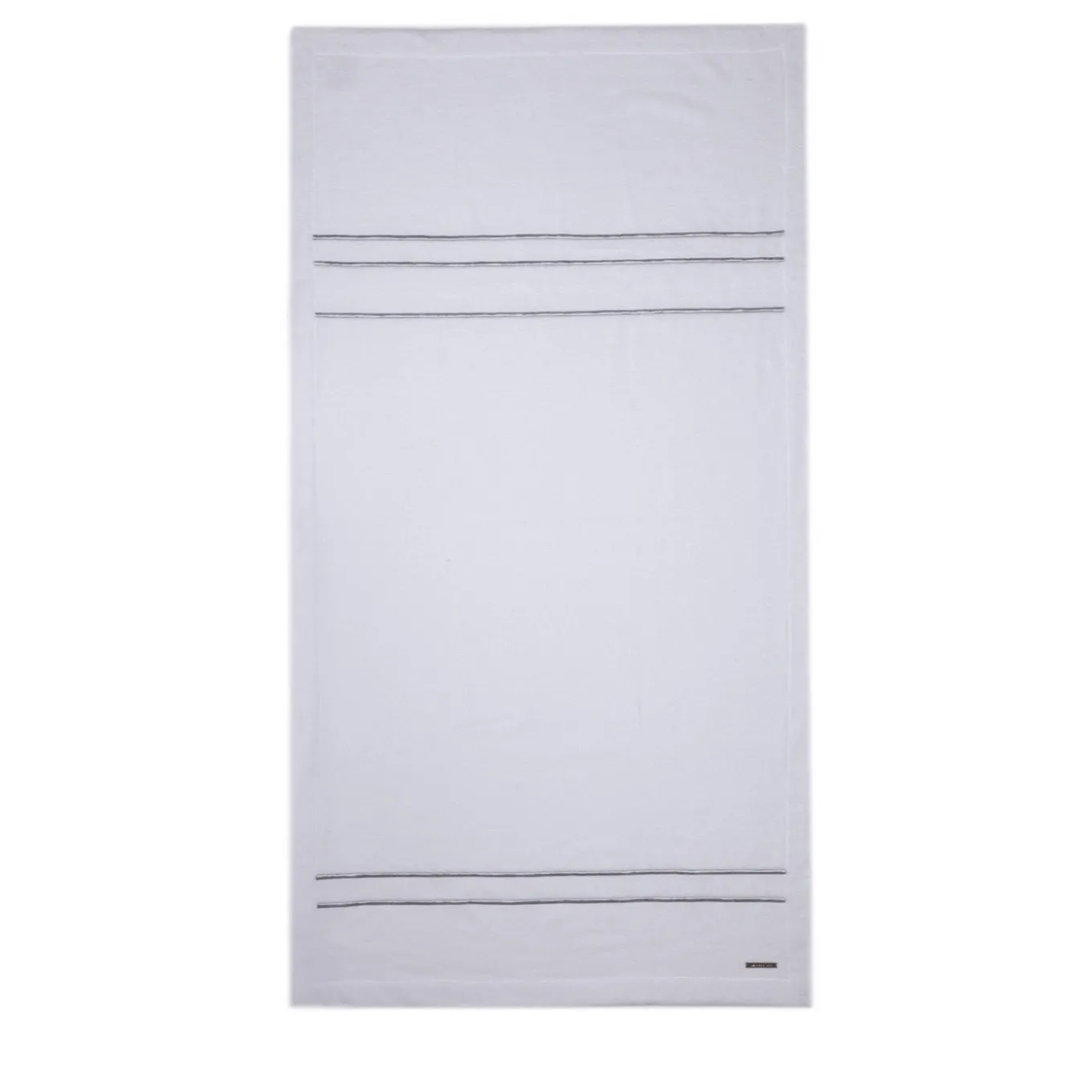 This elegant beach towel in white is crafted in Egyptian cotton of the finest quality, accented by five silver embroideries in Lurex yarn that run across its surface. The metal logo plate has been embossed and sports a palladium finish.