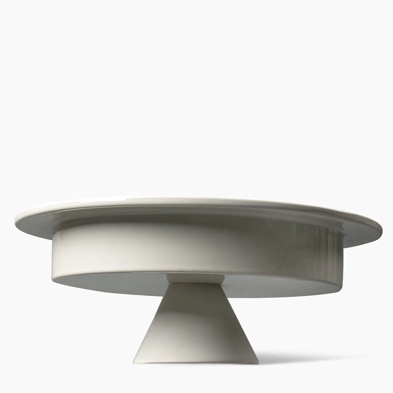 Bolo centerpiece by Karim Rashid features a bright white glossy finish with subtle gray accents and a distinctive central decoration in green, pink, and burgundy hues. Executed using a white clay casting technique, this limited edition piece is one of 349, combining modern design with artistic precision to create a striking yet functional decorative object.