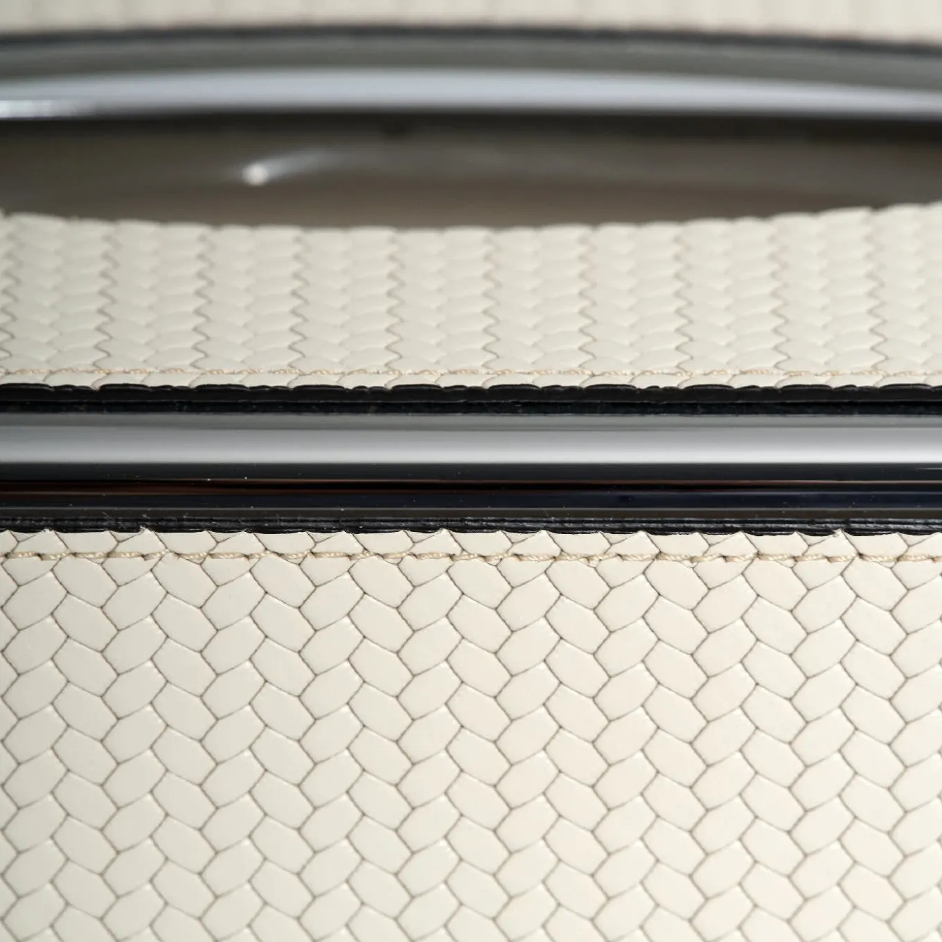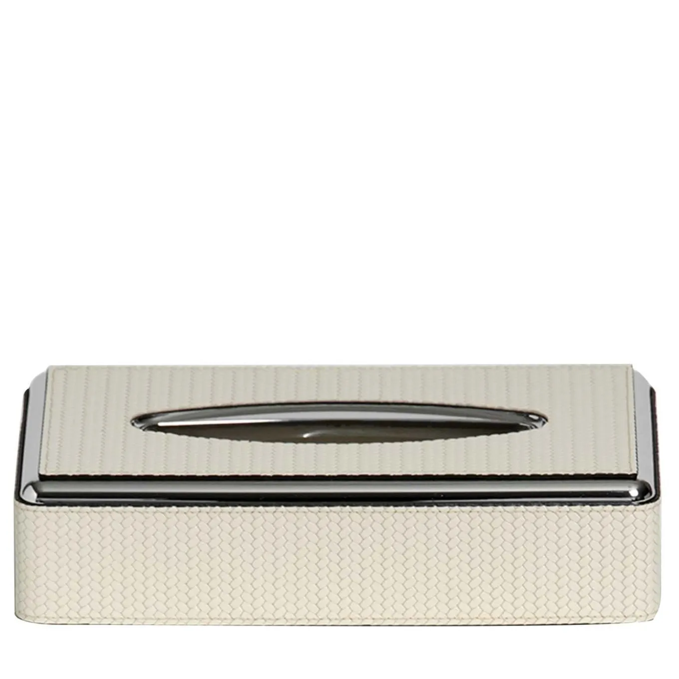 00Sleek and sophisticated, this metal tissue box is a stunning example of modern aesthetic and skilled hand-craftsmanship. Its classic rectangular silhouette is crafted of metal and is adorned with strips of white leather around the sides and framing the tissue opening. The leather’s textured surface and white hue elegantly contrast with the polished metal finish for a striking visual impact. A design for the modern home that is both a luxurious and functional work of art, this tissue box transforms an everyday item into a luxury accent piece.