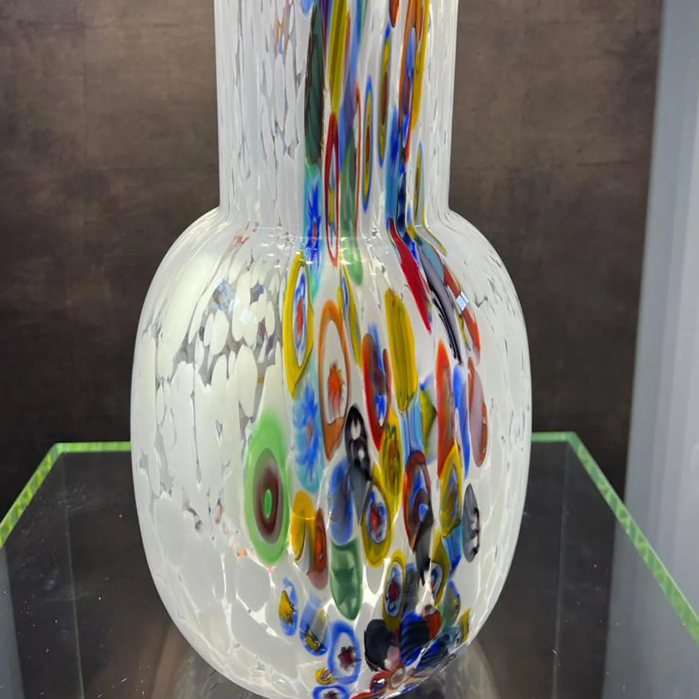 This incredible vase is completely handmade from mouth-blown in Venice. Murrina vase is made using white glass in contrast with multicolour “murrine”. The vase is provided with its certificate of origin.