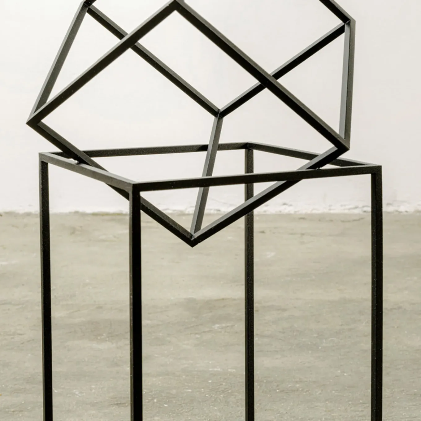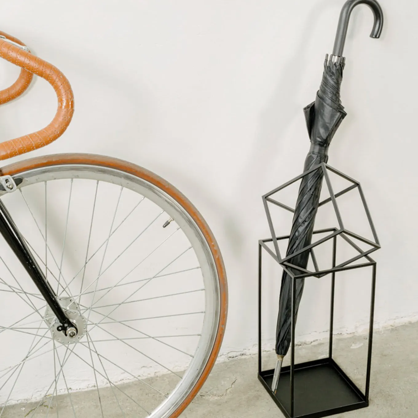 A minimalistic design with a modern edge, this umbrella stand boasts an intriguing, sculptural design that is best displayed along the Who’s Next Magazine Rack, both paying tribute to the legendary British rock group The Who. Crafted of black powder-coated metal, the slim tubular structure is defined by the positive and negative spaces arising from the interplay of the two geometric shapes that compose it. A cube is – seemingly, precariously – balanced on a parallelepiped, creating intersecting lines where the umbrellas rest.