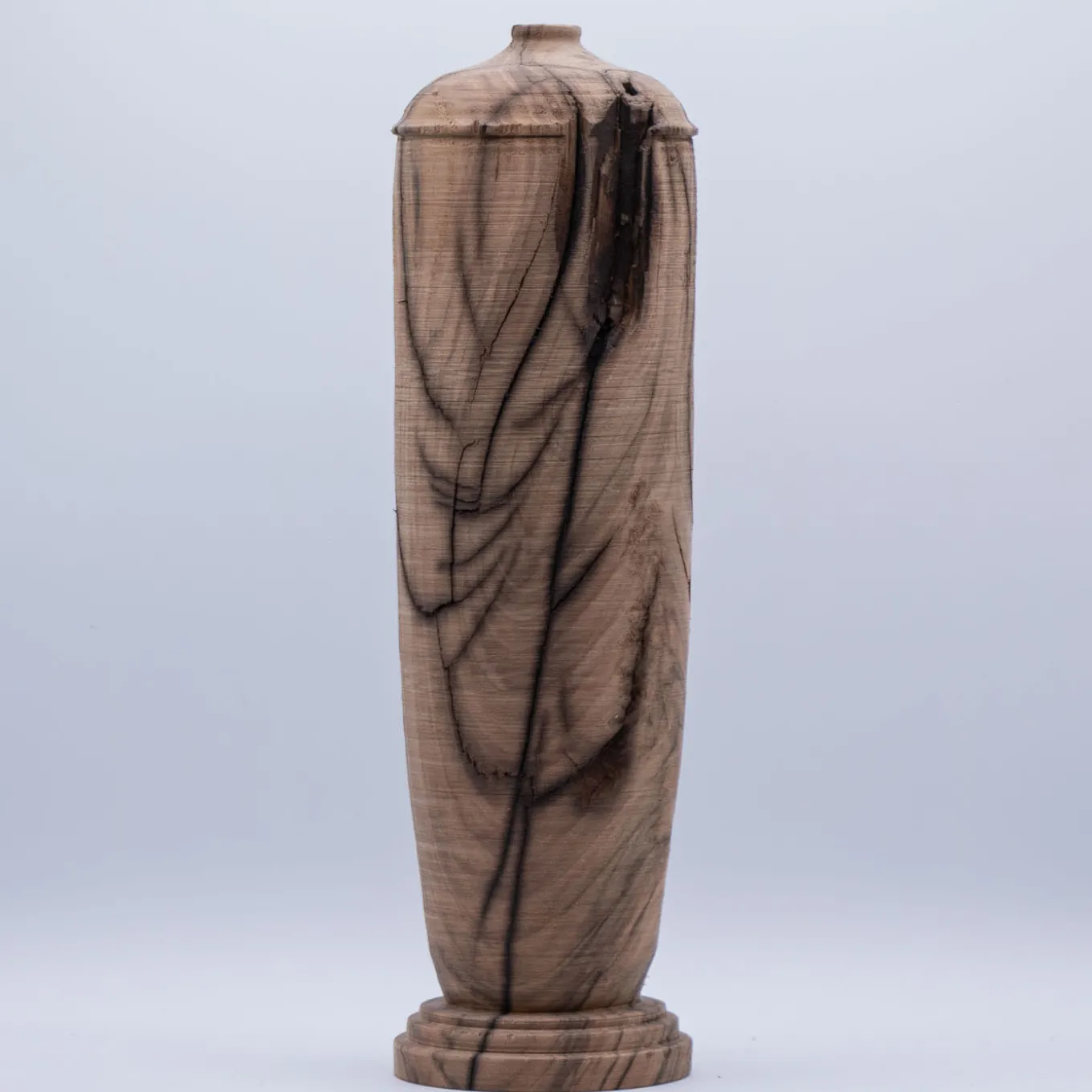 Entirely handcrafted by master woodworker Andrea Celestino, this stunning decorative vase stuns with its exceptional wood grain and graceful silhouette, mounted on a tiered base. Fashioned of walnut wood, the wood is treated with olive oil to seal its natural properties and prevent decay. Do not fill or immerse with water, clean only using a damp cloth.