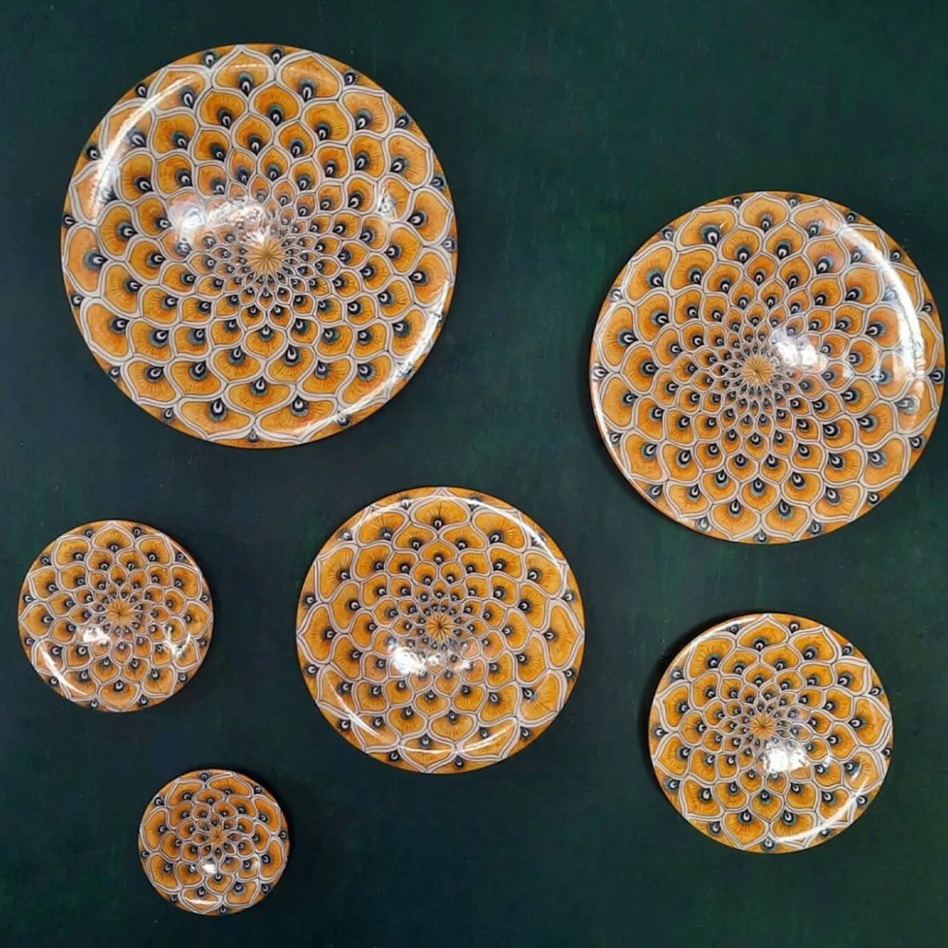 This prized decorative plate (⌀ 30cm) in fine ceramic is sure to uplift any wall with its glamorous personality given by the striking, radial motif of peacock feathers that adorns its pure-white surface. Hand-painted by artist Maria Rita Nicolini, the stunning decoration is executed with painstaking attention to detail, masterfully blending blue and yellow enamels. It can be hung alongside pieces from the same series for a striking look.