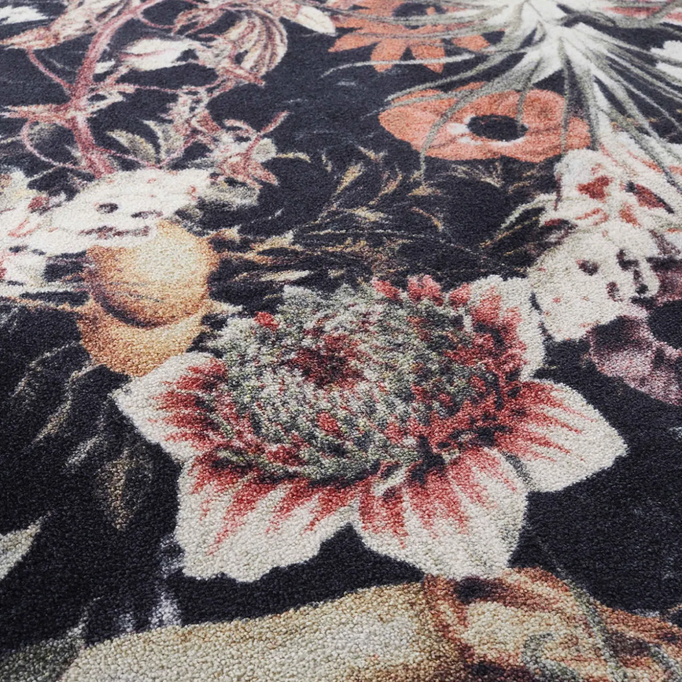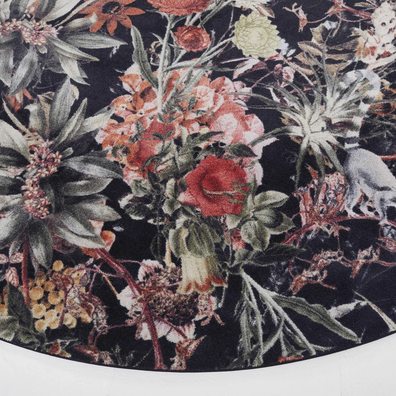 A round rug featuring the Zaira graphic, showcasing detailed exotic flowers and animals set against a dark background. The intricate and vivid design creates a striking contrast, adding depth and movement to the space. This piece combines boldness with elegance, making it suitable for environments seeking a touch of adventure and visual interest without compromising on sophistication.